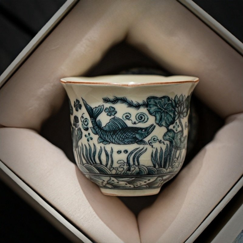 Our Ru Kiln Porcelain Fish and Seaweed Gongfu Tea Cup is designed for both beauty and practicality. The porcelain material ensures excellent heat retention, keeping your tea warm for longer periods. The smooth interior glaze makes it easy to clean, while the sturdy construction ensures durability. The accompanying gift box adds an extra layer of elegance, making it a perfect gift for any occasion. Experience the timeless beauty and tradition of Chinese tea culture with our 1.7 Fl Oz/50 ML Ru Kiln Porcelain Fish and Seaweed Gongfu Tea Cup with Gift Box. Enhance your tea rituals with this exquisite piece that combines artistic craftsmanship with functional design.Find more Japanese teapot set.