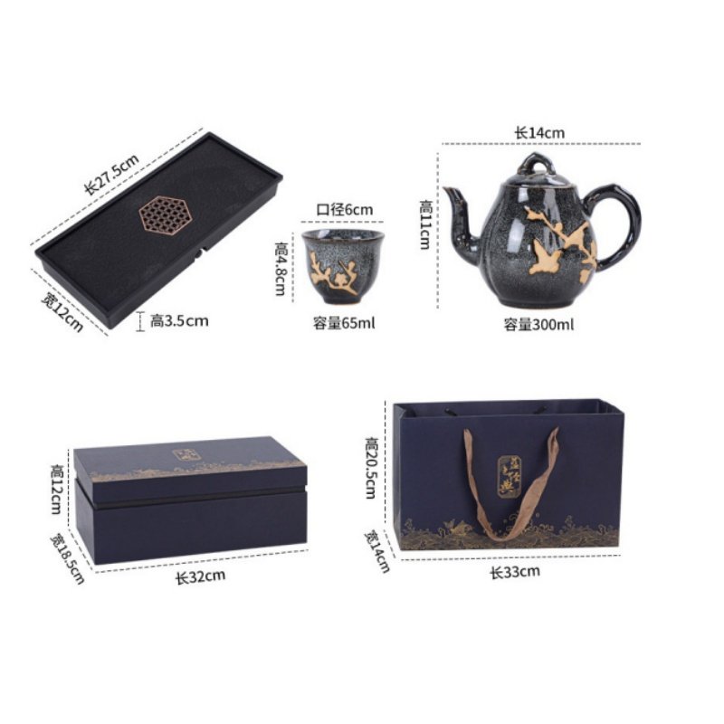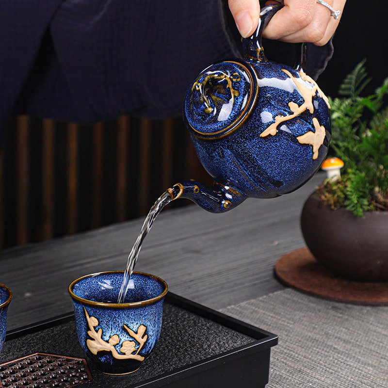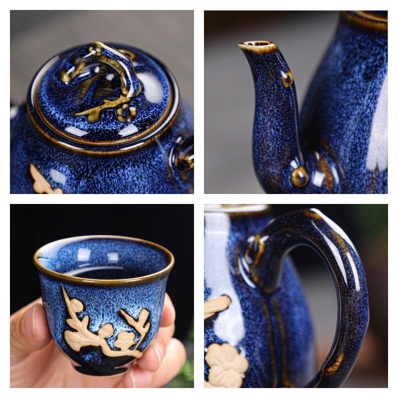 10.1 Fl Oz/300 ML Embossed Plum Ceramic Chinese Blue Teapot And Cup Set.This exquisite set embodies elegance and craftsmanship, making it a perfect addition to any tea lover’s collection. The teapot and cups are coated in a mesmerizing deep blue glaze with a stunning speckled effect, giving them a rich, artistic texture. The embossed plum blossom design, carefully hand-applied in a soft beige hue, adds a touch of nature’s serenity to the set, symbolizing resilience and beauty in Chinese culture. Every element, from the teapot’s gracefully curved spout to the ergonomic handle, is designed to enhance the tea-drinking experience, ensuring a precise, drip-free pour every time.More than just a visually captivating teapot set, this Chinese blue ceramic tea set is crafted from high-quality ceramic, providing excellent heat retention to preserve the full flavor and aroma of your tea. The set includes four matching cups, each designed to fit comfortably in your hand, with smooth, rounded rims for a pleasant drinking experience.This one is best paired with dragon tea set.