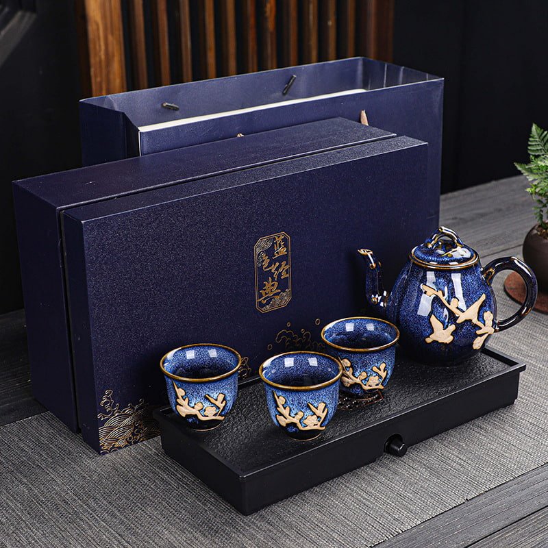Its well-balanced weight and durable construction make it perfect for daily use while still being elegant enough for special gatherings. The striking color contrast between the blue glaze and beige floral relief makes it a true work of art, making it an eye-catching display piece even when not in use.Ideal for brewing a wide range of teas, including green tea, oolong, black tea, and herbal infusions, this set allows you to savor the true essence of each variety. The teapot’s design ensures even heat distribution, allowing tea leaves to unfurl and release their full bouquet of flavors. Each component is thoughtfully crafted to withstand high temperatures, ensuring durability over time. Packaged in a luxurious, elegantly designed gift box, this set is an excellent choice for gifting—perfect for tea enthusiasts, collectors, or anyone who appreciates fine craftsmanship.If you are interested, you can also find dragon teapot and gaiwan tea cups here.