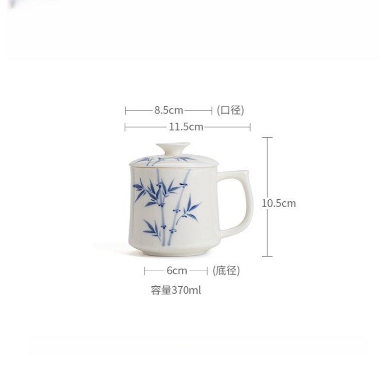 The capacity of the 12.5 Fl Oz/370 ML Bamboo Pattern Blue and White Chinese Porcelain Tea Cup Tea Mug with Ceramic Strainer is 370 ml (12.5 fl oz),width 8.5 cm, height 10.5 cm.Find more Japanese tea sets.