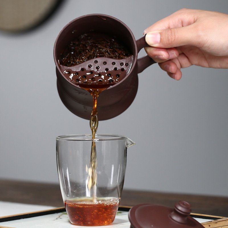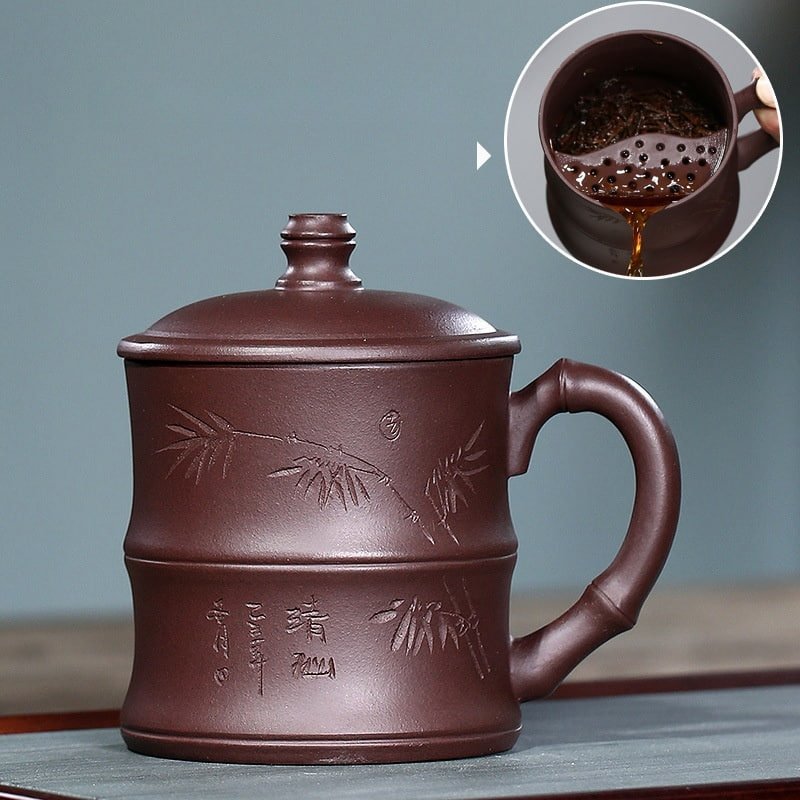 Introducing our 13.5 Fl Oz/400 ML Antique Bamboo Shaped Vintage Chinese Clay Tea Cup and Chawan Set with Purple Clay Strainer and Lid, a perfect combination of traditional craftsmanship and functional design. This tea cup set is crafted to bring a touch of vintage elegance to your tea-drinking rituals, featuring a unique bamboo shape that symbolizes strength and longevity. Ideal for tea enthusiasts and collectors, this set offers both aesthetic appeal and practical use. Made from high-quality clay, this tea cup ensures excellent heat retention, enhancing the flavor and aroma of your tea. The antique bamboo shape is meticulously crafted by skilled artisans, making each piece a unique work of art. The matching chawan (saucer) provides a stable base and adds an extra layer of sophistication to your tea set. The integrated strainer within the cup is designed to make brewing loose leaf tea convenient and enjoyable.Find more Japanese tea cups.