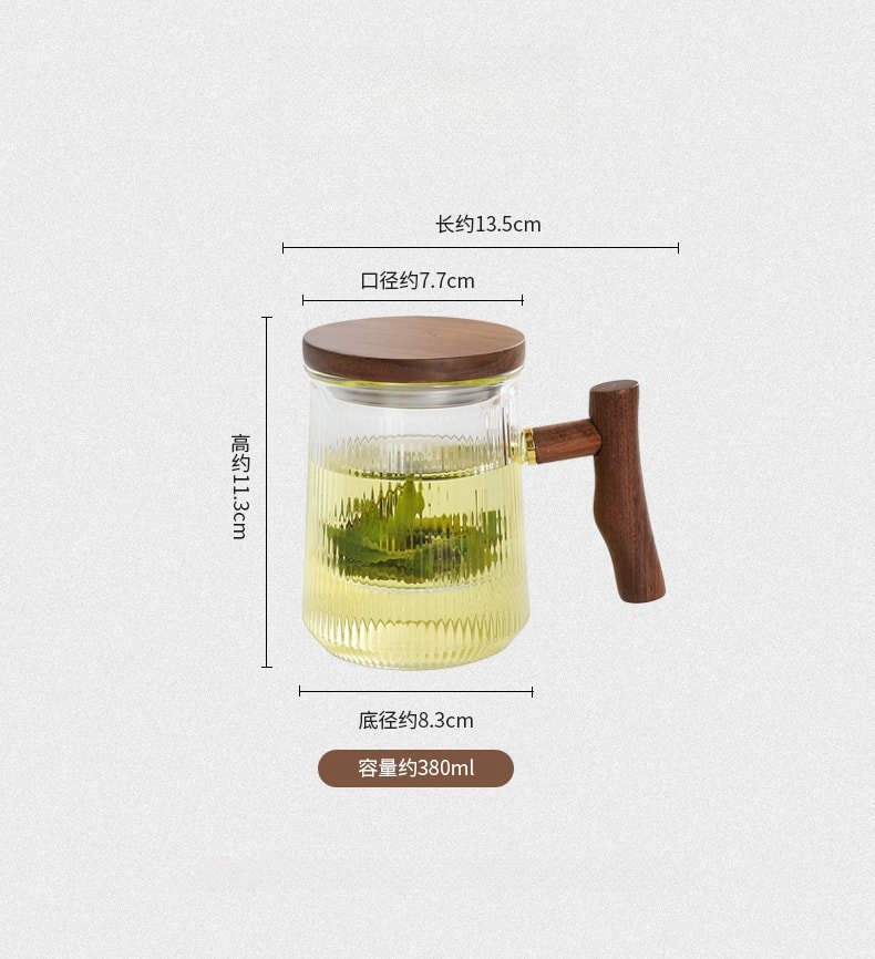This 13.5 Fl Oz/400 ML Crystal Glass Tea Mug with Glass Strainer and Wooden Lid Capacity 400 ml (13.5 fl oz), Diameter 7.7-8.3 cm, height 11.3 cm.Find more travelling tea sets.