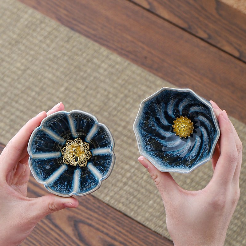 Discover the perfect blend of traditional craftsmanship and modern elegance with the 2.7 Fl Oz/80 ML Blue Golden Gilded Handmade Ceramic Jian Zhan Teacups. These exquisite teacups are handcrafted to perfection, featuring a stunning blue glaze adorned with intricate golden gilded designs. The unique patterns inside each cup resemble delicate floral motifs, adding a touch of sophistication and beauty to your tea-drinking experience. The meticulous craftsmanship ensures that each teacup is a unique work of art, making your tea sessions truly special. Made from high-quality ceramic, the Blue Golden Gilded Handmade Ceramic Jian Zhan Teacups are designed to enhance both the aesthetic and functional aspects of your tea rituals. The thick ceramic walls provide excellent heat retention, keeping your tea at the ideal temperature for longer periods. The smooth, glazed interior not only adds to the visual appeal but also enhances the tactile experience, making each sip a delight. These teacups are more than just functional pieces; they are beautiful art pieces that bring a sense of tranquility and elegance to your daily tea rituals.Find more Japanese tea mugs.