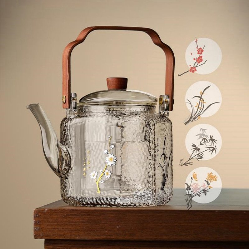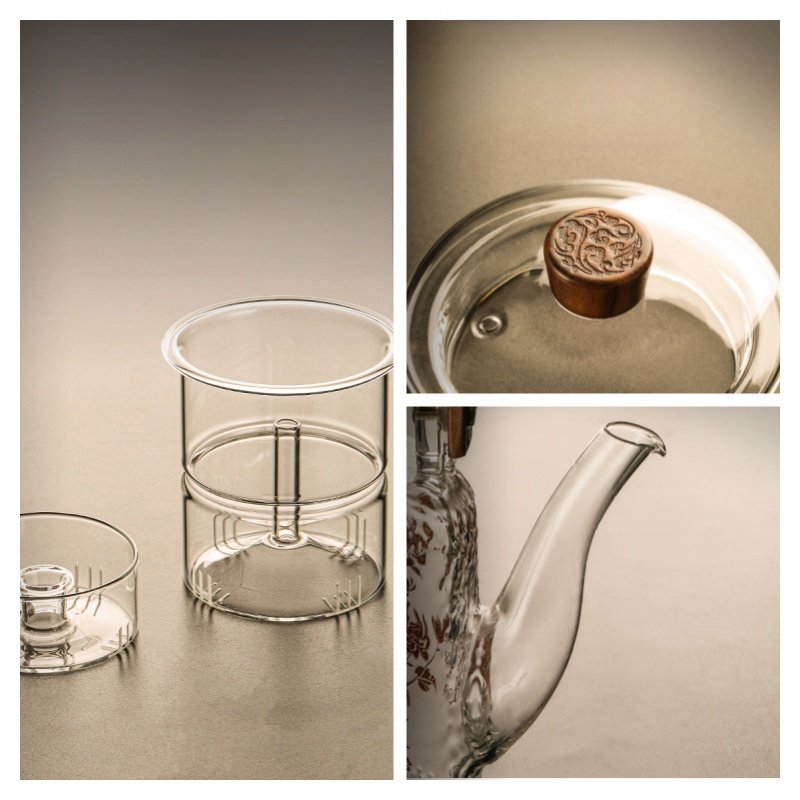 This exquisite teapot combines the charm of antique patterns with the modern functionality of high-quality borosilicate glass. Crafted to perfection, the clear glass body is adorned with delicate floral designs that evoke a sense of timeless elegance. The borosilicate glass is renowned for its durability and heat resistance, ensuring that your teapot remains pristine even with frequent use. The generous 33.8 Fl Oz capacity makes it perfect for serving multiple guests, whether you are hosting an intimate tea party or enjoying a quiet afternoon with family.Find more dragon teapot.The teapot features a built-in infuser, designed to make brewing loose leaf tea a seamless and enjoyable process. The spacious infuser allows tea leaves to fully expand, releasing their full flavor and aroma into the water, ensuring a rich and satisfying cup of tea. The ergonomic handle, crafted from sturdy wood, provides a comfortable and secure grip, making it easy to pour without the risk of spills. This design not only enhances functionality but also adds a touch of rustic charm that complements the elegant floral patterns.Find more brass teapot.