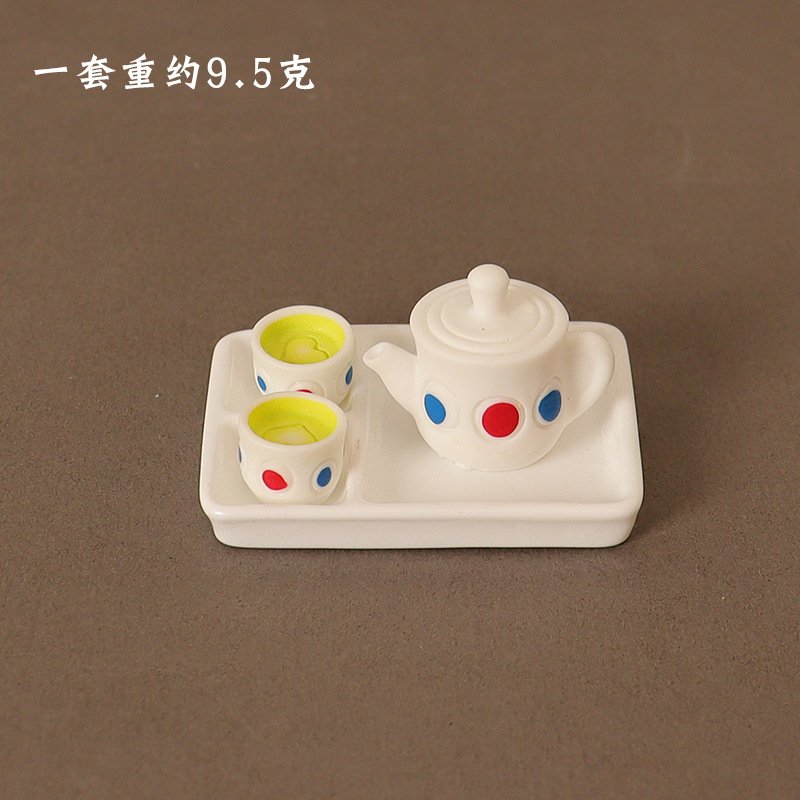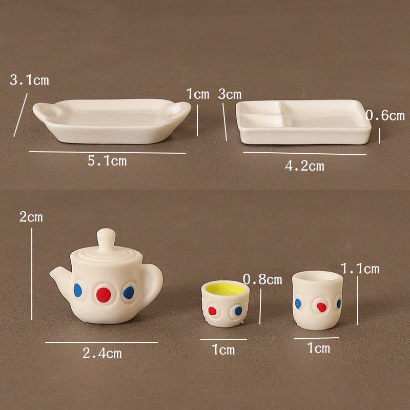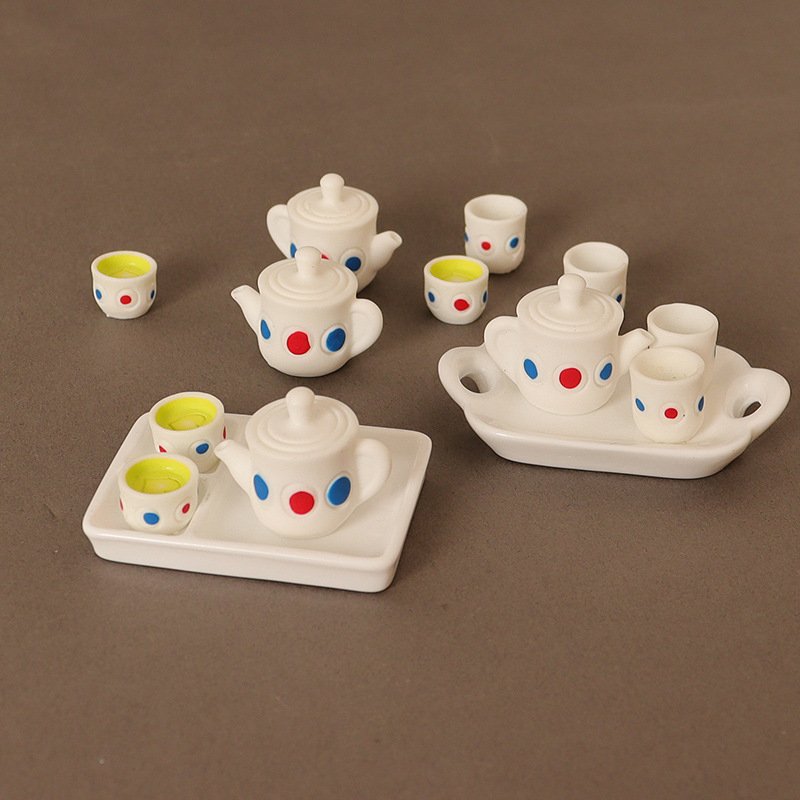 4 Pcs/Set Cute White Resin Dollhouse Miniature Tea Set For Kids.Introduce a world of fun and creativity with the 4 Pcs/Set Cute White Resin Dollhouse Miniature Tea Set. Perfectly designed to inspire imaginative play, this charming tea set is a great addition to your child’s toy collection. With a beautifully crafted teapot and two teacups, each adorned with vibrant red and blue dots, this set stands out as a playful and delightful piece. Made from high-quality resin, it ensures durability while being lightweight, which makes it easy and safe for children to use.The delicate design of this set encourages children to pour, serve, and share, making it a perfect way to practice important social skills such as conversation, turn-taking, and cooperation. The colorful dots on the teapot and cups not only provide a fun and engaging aesthetic but also help children recognize colors and improve their visual coordination. The compact and lightweight nature of the set makes it easy for young hands to maneuver, giving them a sense of accomplishment as they handle each piece. Moreover, this set is the perfect size for dollhouses, providing endless opportunities for children to create imaginative scenarios and role-play adventures with their favorite toys.If you are interested, you can also find automatic tea sets and miniature teapots here.