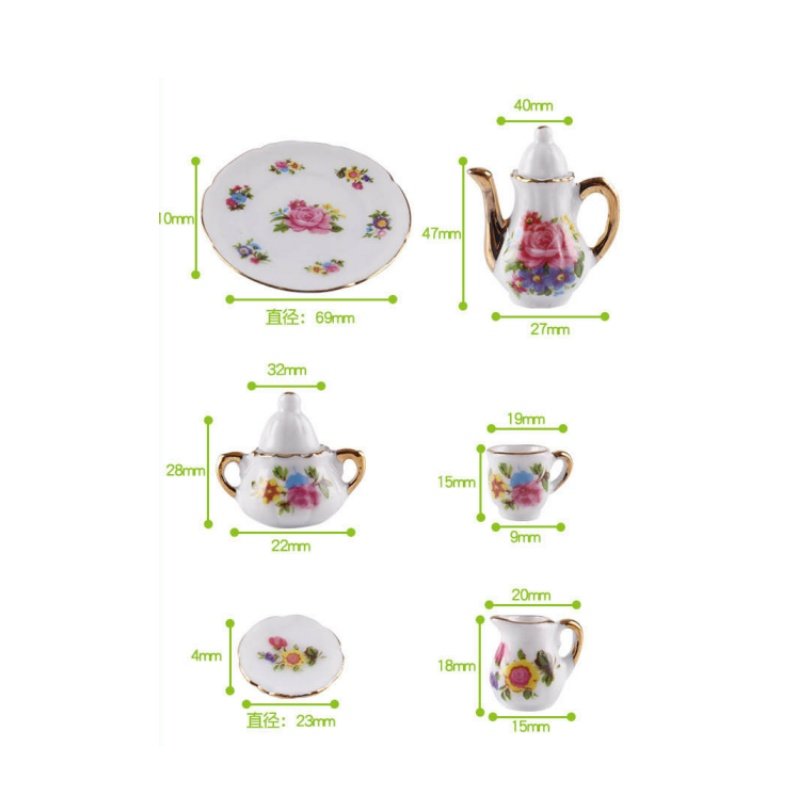 8 Pcs/Set Antique Rose Flower Miniature Porcelain Dollhouse Coffee Tea Set, includes : 2 Teacups ( 9*15mm ) , 1 Teapot ( 27*47 mm) , 1 Sugar Pot ( 23*32mm ) , 1 Milk Pot ( 15*18mm ) , 2 Saucers ( 23*4mm ),1 Have Tray (69*10 mm).Find more kung fu tea sets.