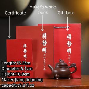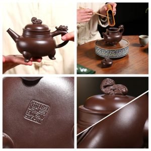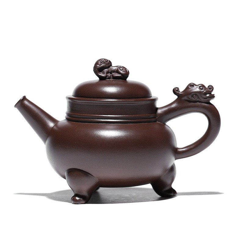 9.8 Oz Antique Dragon Tripod Chinese Purple Clay Yixing Teapot With Famous Maker’s Marks.Known for its enduring quality and history, Yixing purple clay is famed for enhancing the flavor of tea with each use, making this teapot a must-have for any tea enthusiast or collector. Its elegant yet functional design features intricate details, including a dragon-shaped spout that symbolizes power and nobility. The spout is not only aesthetically pleasing but also functional, ensuring a smooth and controlled pour every time. The tripod feet of the teapot provide both practical stability and a striking artistic flair, making it an eye-catching piece for any teapot collection.Made from Yixing clay, this teapot has the perfect combination of durability and porosity, allowing it to absorb the flavor of tea over time, making each brew more flavorful and enhancing your tea experience with every use. The natural properties of Yixing clay ensure that the teapot retains the ideal temperature and allows the tea to reach its fullest flavor potential. This teapot is the perfect vessel for a variety of teas, from green and black to oolong and white, as it allows the leaves to expand fully and release their complex flavors.Want to have more similar ones? You can try kung fu tea sets and Chinese teapots.