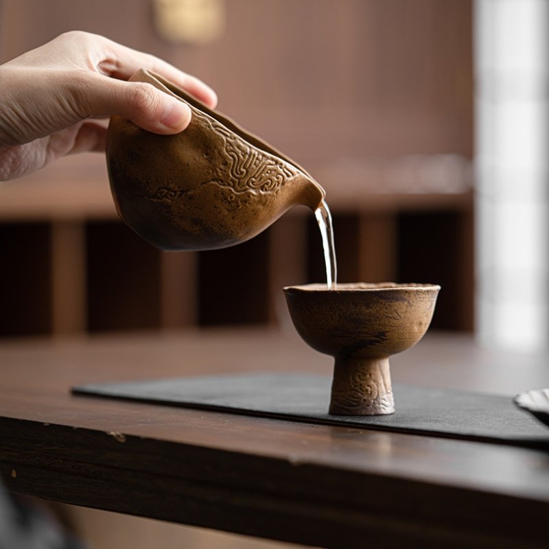 Antique Japanese Auspicious Clouds Brown Glaze Old Clay Chahai Gongfu Tea Ceremony Accessories. This exquisite chahai, or “fairness cup,” embodies the timeless philosophy of wabi-sabi, where simplicity and the beauty of imperfections are revered. The chahai’s rich brown glaze, crafted from old clay, offers a unique organic texture that feels alive under your fingers. Each piece is adorned with intricate engravings of auspicious clouds, symbolizing harmony and prosperity in Japanese culture. These cloud patterns are delicately carved to blend seamlessly with the natural curves of the clay, reflecting the skilled artistry of Japanese craftsmen. The irregularities in the glaze, along with the raw finish of the clay, ensure that no two pieces are exactly alike, making every chahai a truly individual work of art. This element of uniqueness turns each tea session into a meditative experience, grounding you in the present moment as you appreciate the artistry in every pour.