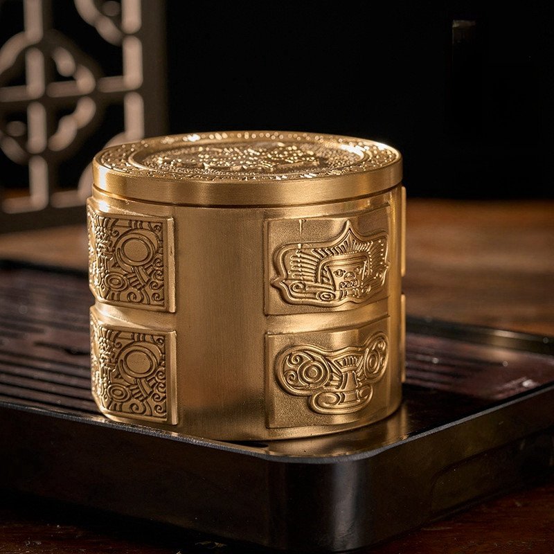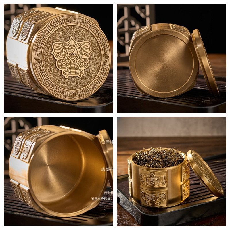 Each detail of this tea container speaks of the artisan’s attention to detail—from the polished bottom that ensures a stable placement to the multi-faceted engravings that enrich its surface. The fine polishing at the bottom reveals the pure color and sheen of the brass, contributing to the overall aesthetic appeal. Good sealing properties of the lid keep the contents fresh and protect them from external elements, making it ideal for storing various types of loose leaf tea.