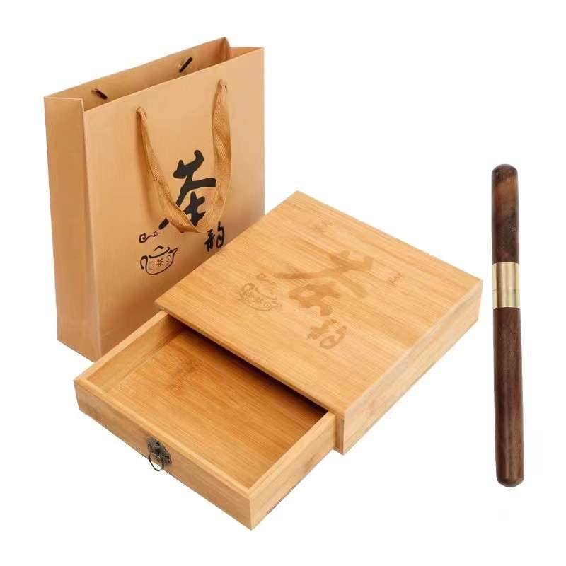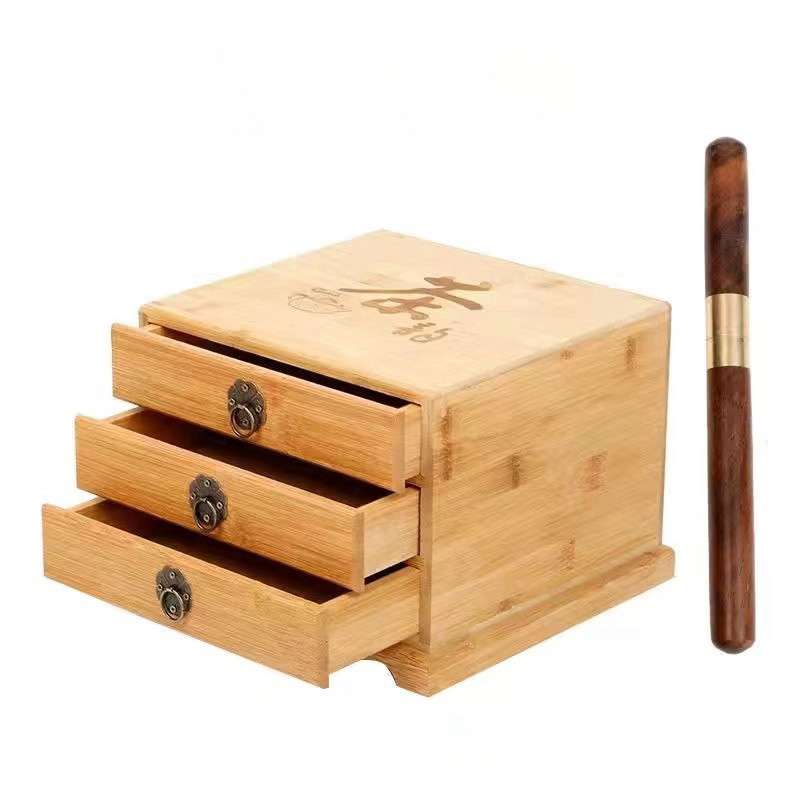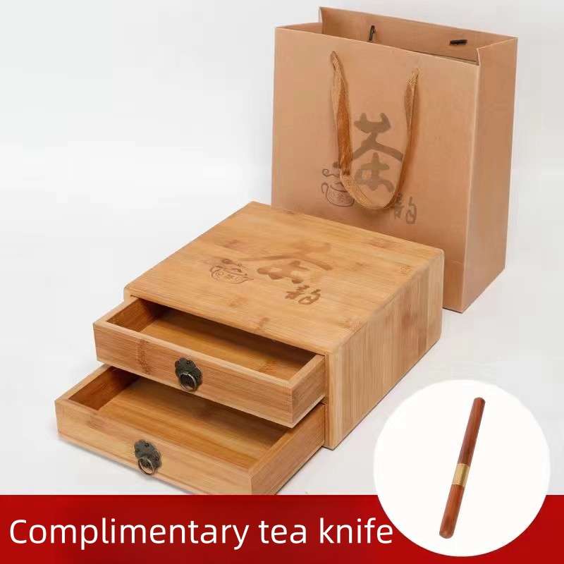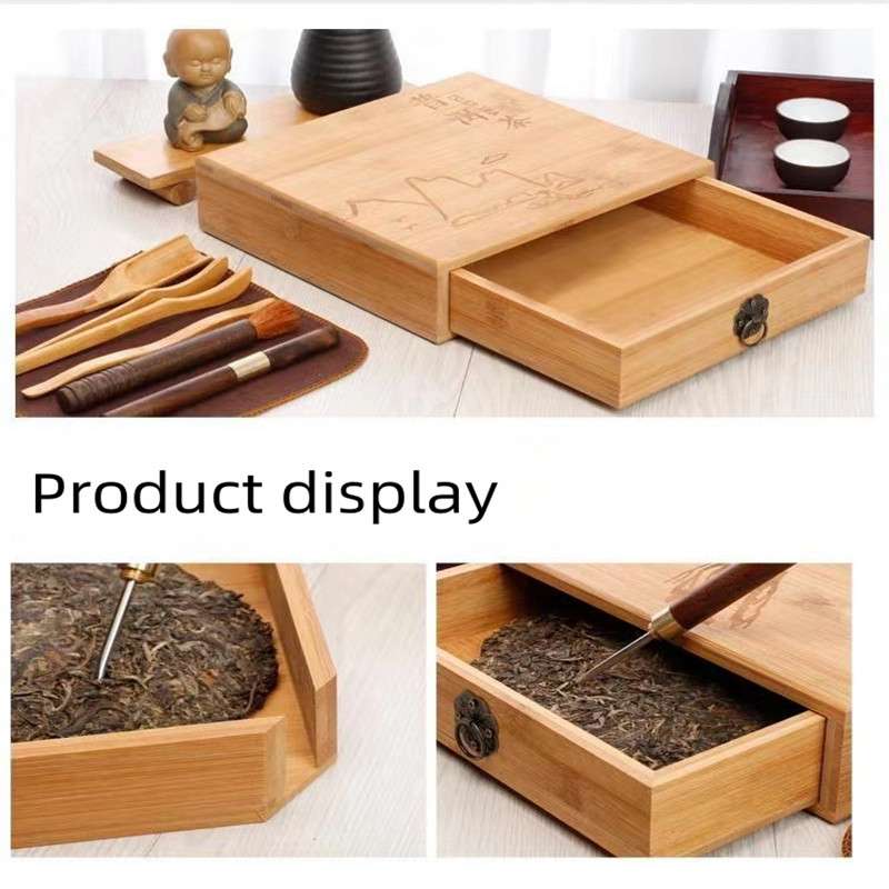 The smooth, flowing lines and bright color of the bamboo material highlight its high-quality craftsmanship. The drawer is designed with an open corner for easy access, making it simple to take out or put in tea. Additionally, the box comes with a complimentary tea knife, allowing for convenient handling of your tea cakes. This storage box is not only practical but also a stylish addition to any home, combining functionality with a beautiful, natural look.