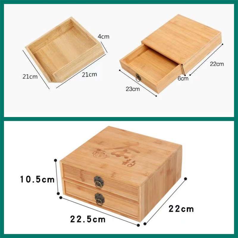 The Best Bamboo Wooden Tea Cake Storage Box with Drawers and Organizer is available in three sizes: 1 Tier(21cm x 21cm x 4cm), 2 Tier (23cm x 22cm x 6cm), 3 Tier(22.5cm x 22cm x 10.5cm).