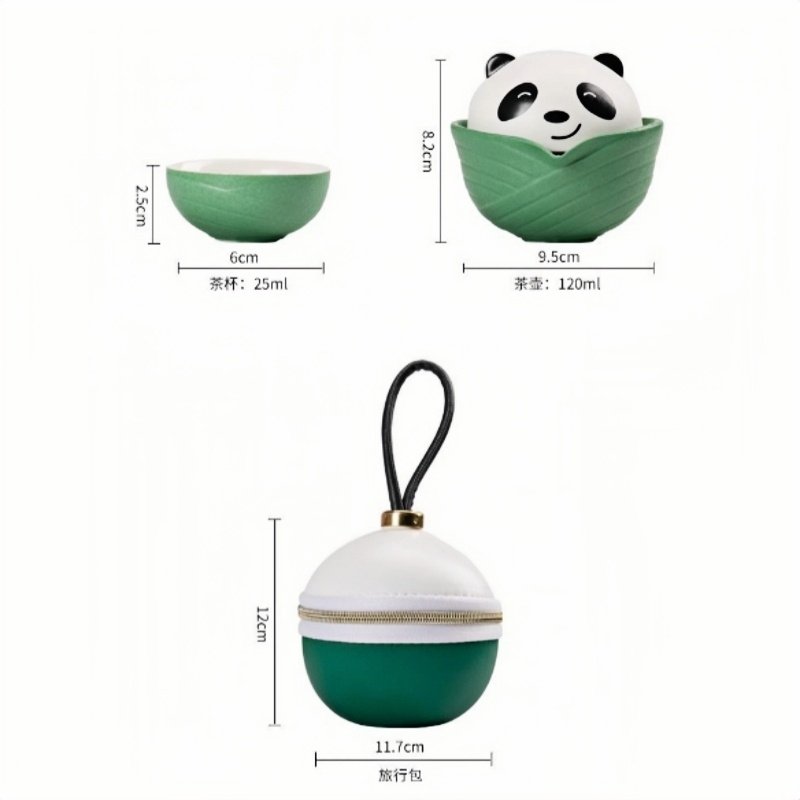 The Best Cute Panda Theme Ceramic Portable Travel Tea Container Kit for One includes a small tea bowl, a panda-themed cup, and a practical travel container. The bowl measures 6 cm in diameter and 2.5 cm high, suitable for 25 ml servings. The panda cup is 9.5 cm wide and 8.2 cm tall, with a capacity of 120 ml. The container stands 11.7 cm tall and 12 cm wide, equipped with a zipper and carrying loop for easy transport.Compact Stackable Design.Find more turtle tea pet.
