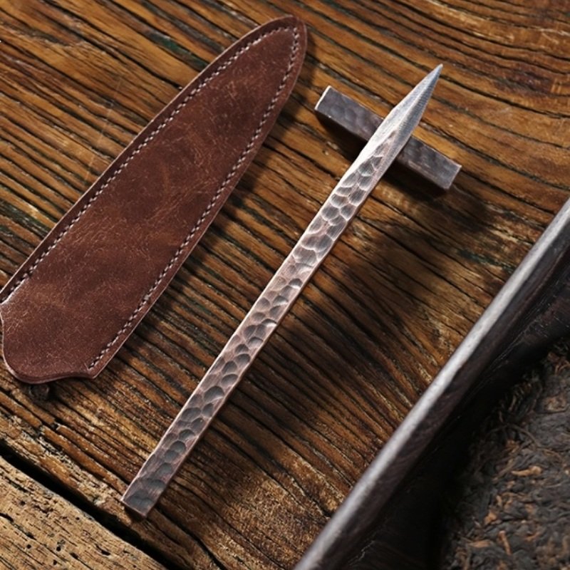 The ergonomic handle of this tea knife is thoughtfully designed for comfort and secure grip. The lightweight yet sturdy construction allows for effortless handling, reducing strain during use. Its compact form makes it a practical choice for daily use or as a travel companion for tea ceremonies on the go. The knife also comes with a high-quality leather sheath, adding a layer of protection and style. The sheath not only safeguards the blade but also ensures safe portability, making it easy to carry this artistic tool wherever your tea journey takes you. The combination of functionality and design makes this knife a perfect tool for those who appreciate the finer details of tea culture.For collectors, this knife serves as a beautiful representation of traditional craftsmanship and modern functionality. Its purple copper blade is not only durable but also exudes a vintage aesthetic that complements any tea setup. The hammered texture on the blade gives it a unique character, ensuring it stands out as a centerpiece in your collection. This knife also makes for an exceptional gift, offering a blend of artistry and practicality that any tea lover will cherish.