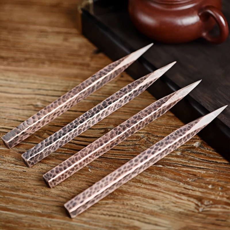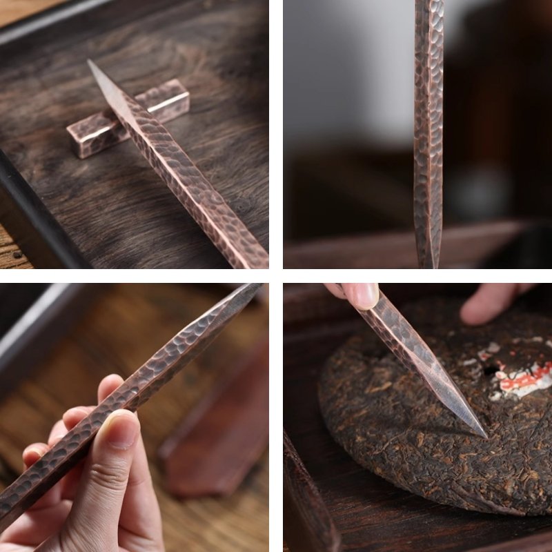 Best Traditional Handcrafted Purple Copper Vintage Tea Ceremony Knife.Crafted from premium purple copper, this knife combines durability with timeless aesthetic appeal. The blade showcases a distinct hammered texture, a hallmark of meticulous craftsmanship that not only adds visual interest but also highlights its artisanal quality. Its sharp, tapered edge is specifically designed to effortlessly break apart compressed tea cakes and bricks, ensuring the delicate tea leaves remain intact. This precision ensures you retain the full flavor and aroma of your tea, making every cup a true delight.This tea knife is more than just a functional tool—it’s a statement piece that embodies the harmony between art and utility. The hammered surface of the blade reflects traditional crafting techniques, lending a vintage charm to your tea accessories. Its precision design caters to both novice tea enthusiasts and seasoned connoisseurs, making it an indispensable addition to any tea collection.