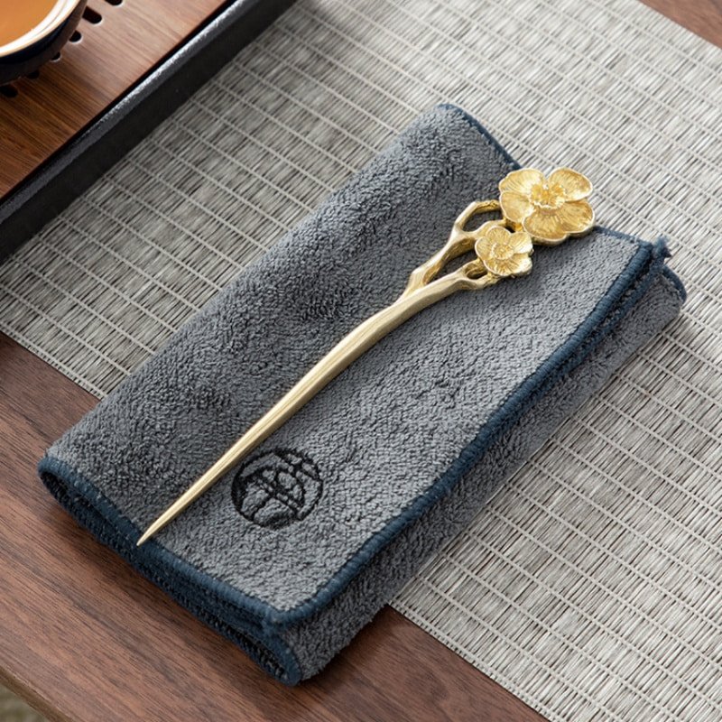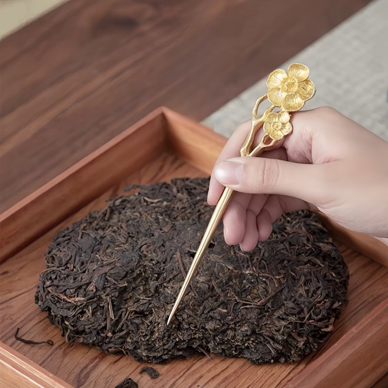 Best Traditional Handmade Chinese Antique Plum Theme Brass Tea Ceremony Needle For Sale.Handcrafted from premium brass, this tea needle features a detailed plum blossom motif, symbolizing resilience, beauty, and elegance in Chinese culture. The intricate design, with its lifelike branches and blossoms, not only reflects traditional craftsmanship but also adds a touch of sophistication to any tea session. The sharp and tapered needle is specifically crafted for loosening compressed tea cakes or bricks, ensuring that the delicate tea leaves remain intact, preserving their flavor and aroma for an authentic brewing experience.This tea needle stands out as a perfect blend of utility and aesthetics. Its durable brass construction ensures it remains a reliable tool for years to come, while the plum blossom theme brings a unique cultural and artistic charm to your tea accessory collection. Its design caters to both novice tea enthusiasts and seasoned connoisseurs, offering a seamless and enjoyable tea preparation experience.The ergonomic design of this needle prioritizes comfort and control, ensuring a secure grip during use. Its lightweight yet sturdy structure makes it easy to handle, allowing you to loosen even the densest tea cakes with minimal effort. The tool’s compact size ensures it fits conveniently into any tea set, making it ideal for both daily use and travel. Accompanying the needle is a high-quality protective cloth, designed to safeguard its surface and intricate detailing. This thoughtful addition ensures the needle remains in pristine condition, retaining its elegance and functionality over time.