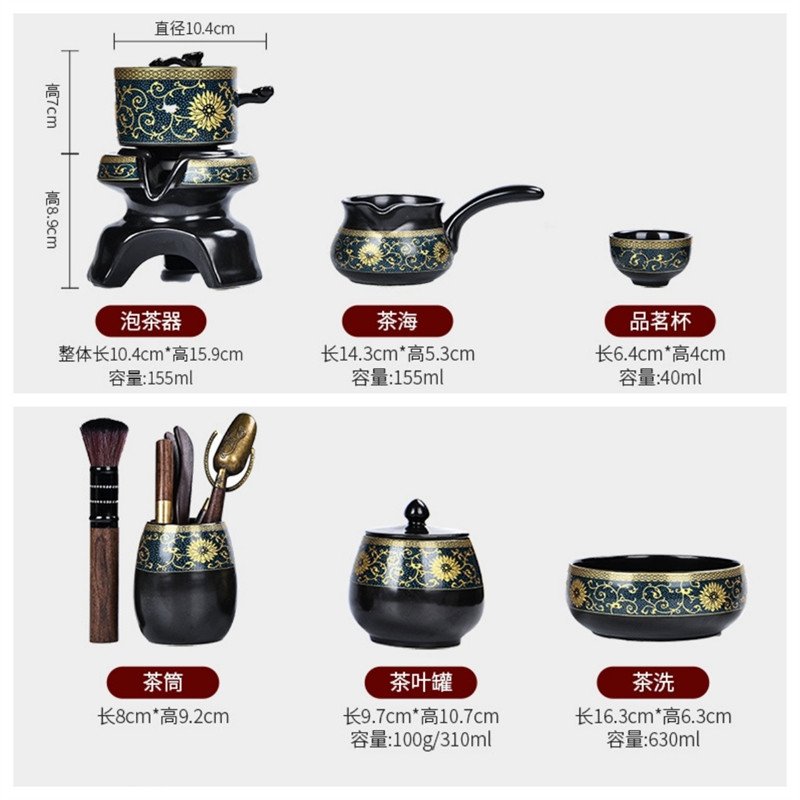 The Black Glaze Tangled Branches Pattern Ceramic Lazy Semi Automatic Tea Set includes: 1 Tea Brewer (10.4 cm*15.9 cm,5.24 fl oz), 1 Fair Cup (14.3 cm*5.3 cm,5.24 fl oz), 8 Teacups (6.4 cm*4 cm,1.35 fl oz), 1 Tea Washer (16.3 cm*6.3 cm,21.3 fl oz), 1 Tеa Utensils Sets (8 cm*9.2 cm).Find more Porcelain Chinese tea sets.