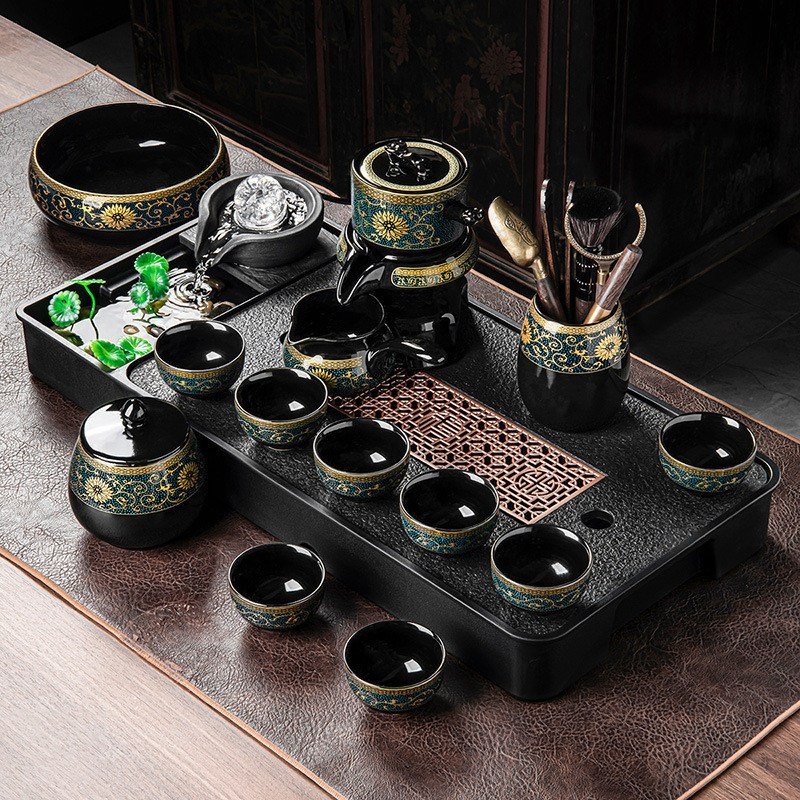 This Black Glaze Tangled Branches Pattern Ceramic Lazy Semi-Automatic Tea Set harmonizes ancient artistry with modern convenience, making it a standout addition to any tea lover’s collection. The set’s semi-automatic feature revolutionizes the tea-pouring experience, allowing you to serve with a simple twist of the wrist. This advanced mechanism ensures that your tea is always brewed and served at the perfect temperature, eliminating the need for waiting and preserving the integrity of the flavor. Whether you are a seasoned tea connoisseur or new to the art of tea-making, this set simplifies the process, making it both enjoyable and accessible to all skill levels.Find more chinese tea cups.