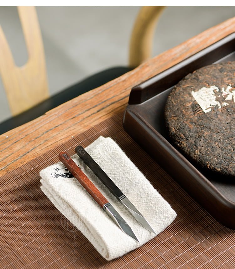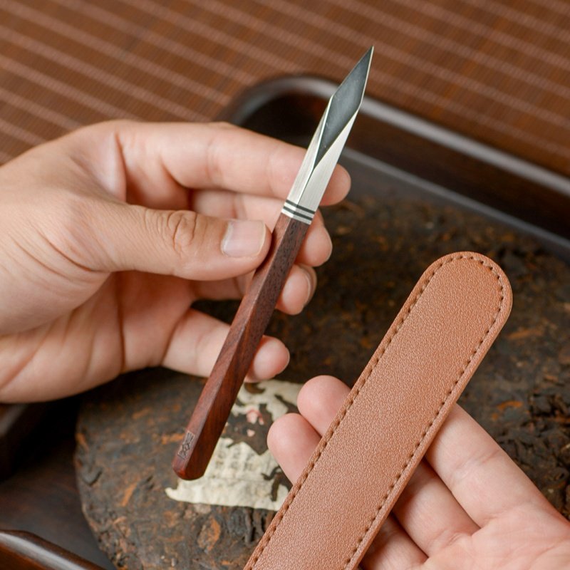 Blackwood And Rosewood Traditional Chinese Damascus Steel Tactical Tea Cake Knife.This meticulously handcrafted tool embodies a perfect blend of traditional artistry and modern functionality, making it an essential accessory for tea enthusiasts. The blade is forged from premium Damascus steel, celebrated for its exceptional durability and the intricate wave-like patterns that adorn its surface. Engineered for precision, the blade effortlessly cuts and loosens compressed tea cakes and bricks, ensuring that the delicate tea leaves remain intact. This preserves the full flavor and aroma of the tea, enhancing your brewing experience.The knife features an ergonomic handle available in two exquisite finishes: blackwood and rosewood. Both options provide a luxurious texture and rich color, while the ergonomic design ensures a secure and comfortable grip. The natural wood grain of each handle adds a distinctive character, making this tool as beautiful as it is practical.