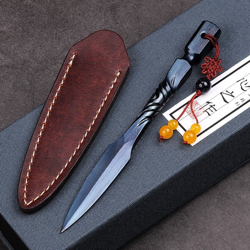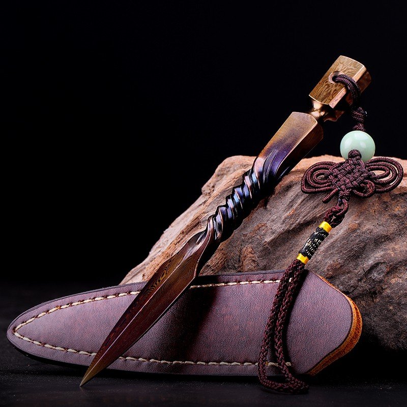 Blue And Purple Antique Tactical Pattern Steel Pu Erh Tea Cake Ceremony Knife.Designed for tea enthusiasts, this knife is crafted from premium tactical pattern steel, renowned for its durability and striking visual appeal. The blade’s captivating blue and purple gradient finish not only adds a unique aesthetic but also ensures precision in cutting through compressed tea cakes. Its sharp edge preserves the integrity of delicate tea leaves, allowing you to enjoy their full flavor and aroma in every brew. With an ergonomic handle that features intricate craftsmanship and a secure grip, this knife provides exceptional control, making it suitable for both beginners and seasoned tea lovers.The design goes beyond practicality to embody a sense of elegance and sophistication. Its compact and lightweight structure makes it an excellent choice for tea preparation at home or on the go. The included handcrafted leather sheath offers not only a safe storage solution but also complements the knife’s luxurious design. The sheath protects the blade, ensuring it remains sharp and maintains its brilliant gradient finish over time.