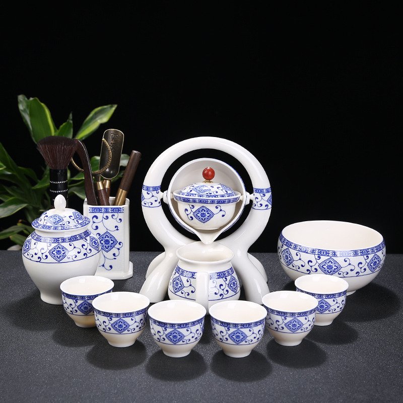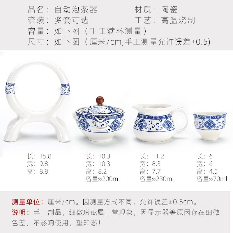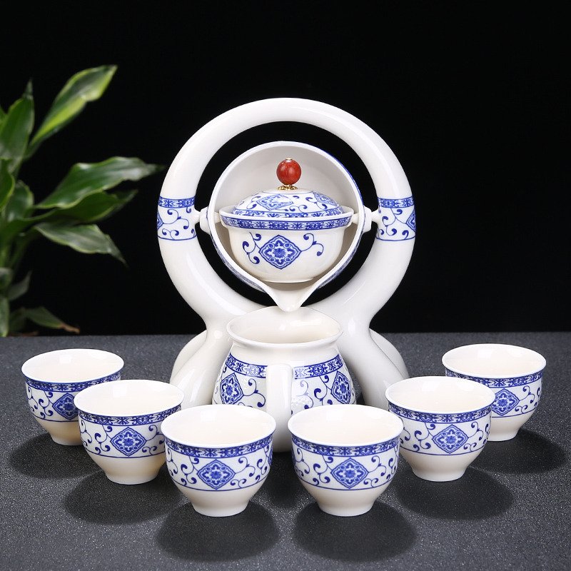 Blue and White Porcelain Semi Automatic Lazy Tea Set with Circle Stand