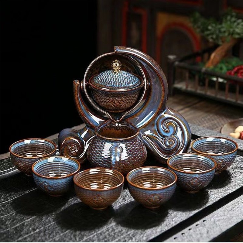 The Blue Brown Glaze Jump Knife Carving Pattern Lazy Semi Automatic Tea Set showcases a unique and beautiful blue and brown glaze. Its intricate jump knife carving patterns add a touch of rustic elegance to your tea service. The semi-automatic pouring system simplifies the tea preparation process, allowing for a smooth 90-degree flip pour that guarantees a graceful and spill-free experience. The design is complemented by a public cup with a spout that ensures a powerful and controlled pour, enhancing your tea rituals with ease and style. Each piece of the set is designed with usability and aesthetics in mind, featuring detachable components for easy cleaning and maintenance. Inside the tea bowls, a built-in stainless steel mesh filter meticulously strains tea leaves, providing a clear and refined brew. The handle of the tea pot is crafted with anti-scalding insulation to ensure safe handling.Find more stainless steel tea kettles.
