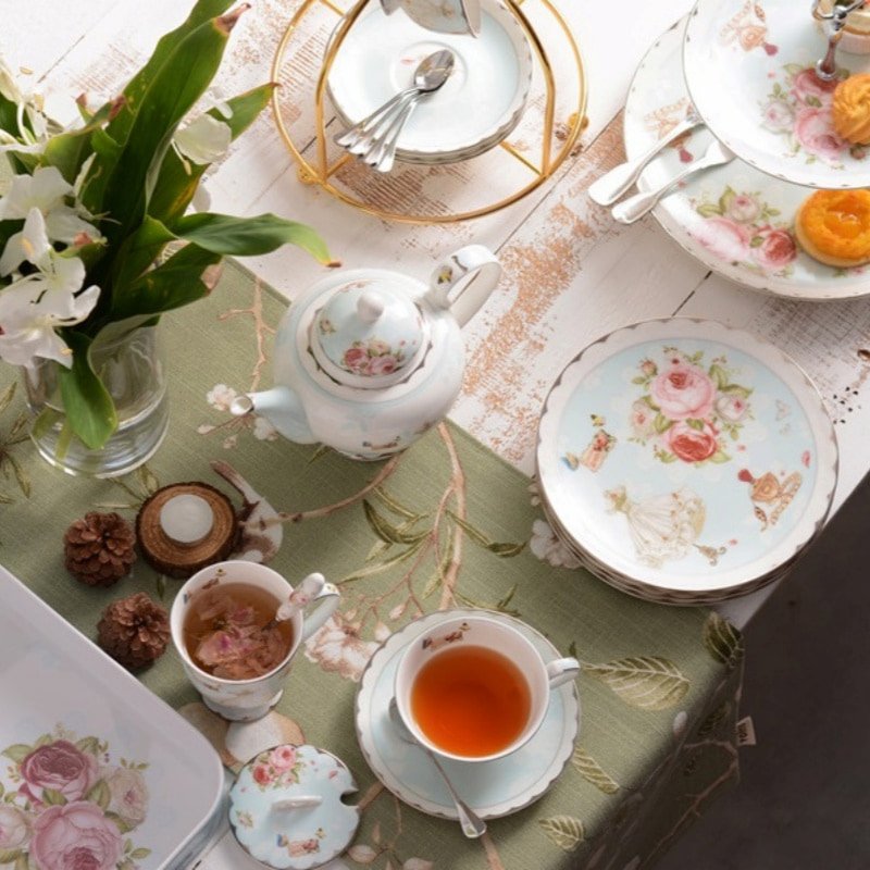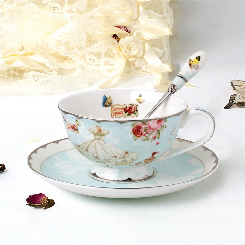 Blue Refreshing Flower and Butterfly Vintage Bone China Tea Cup Set with Saucer