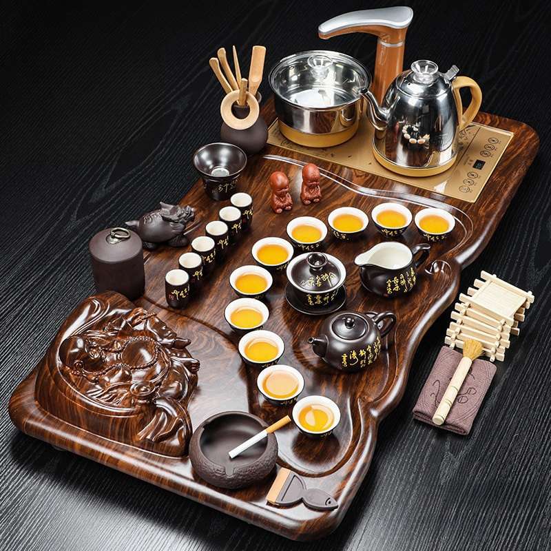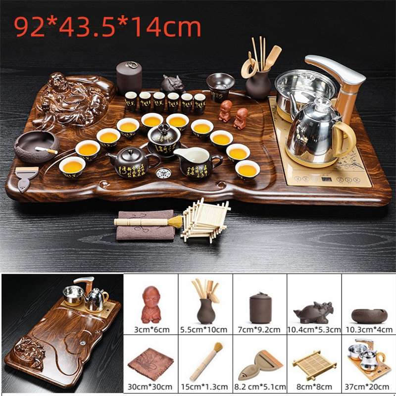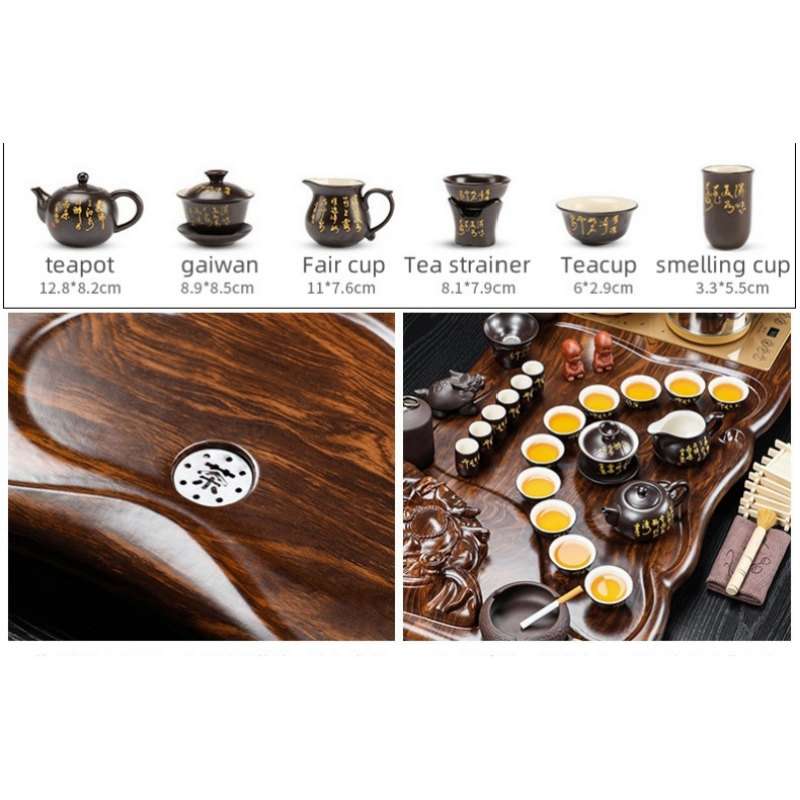 This elegant set includes : 1 Teapot ( 12.8cm*8.2cm , 130ml/4.4 fl oz ) , 1 Gaiwan ( 8.9cm*8.5cm ) , 1 Fair Cup (11cm*7cm ) , 10 Tea Cup (6cm*2.9cm ) , 6 Aroma Cup ( 3.3cm*5.5cm ) , 1 Tea Tray (92cm*43.5cm*14cm ) , 1 Tea Utensils Sets ( 5.5cm*10cm ) , 1 Tea Infuser ( 8.1cm*7.9cm ) , 1 Tea Caddy(7cm*9.2cm ) , 1 Tea Scraper ( 8.2cm*5.1cm ) , 1 Teapot Maintenance Brush ( 15cm*1.3cm ) , 1 Automatic filling water bottle ( 37cm*20cm ) , 1 Ashtray (10.3*4cm ) , 2 Tea Pet (3cm*6cm ), 1 Tea Towel ( 30cm*30cm ) , 1 Yixing Clay Dragon Turtle ( 10.4cm*5.3cm ) , 6 Coaster ( 8cm*8cm ) .Find more tea serving trays.