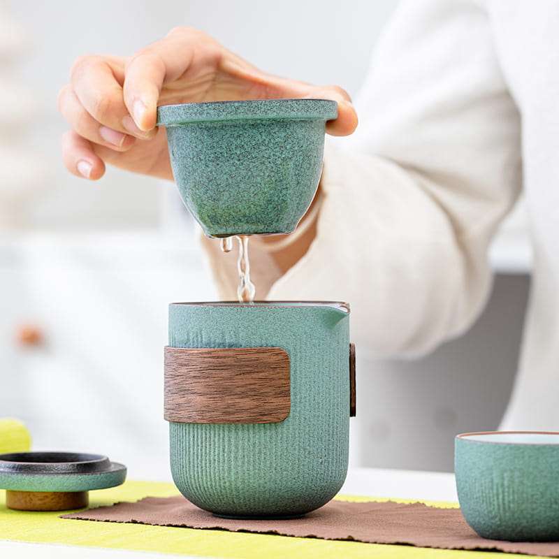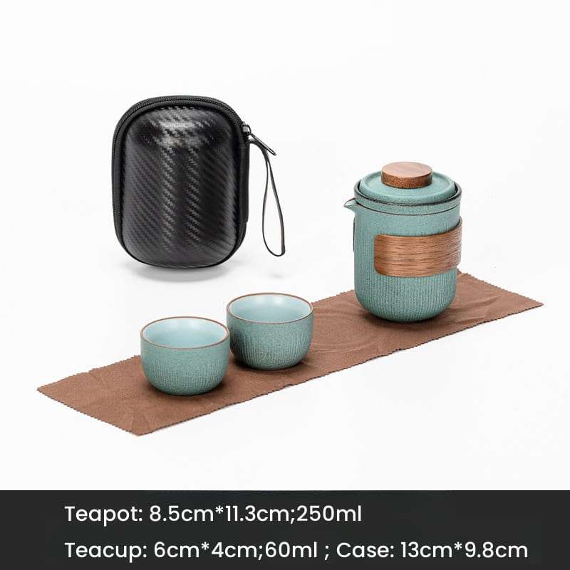 Crafted from high-quality kaolin clay, this Celadon Stripes Antique Ceramic Travel Tea and Coffee Set Case with case boasts a robust construction and a finely textured sandblasted finish, achieved through high-temperature calcination, enhancing its tactile appeal. The serene celadon glaze, adorned with rhythmic stripe patterns, adds a simplistic yet elegant aesthetic that complements any setting from your home to your office. Its compact and secure design makes it an ideal companion for your tea rituals, whether you’re at work, relaxing, or on the move. The celadon glaze not only enhances the visual beauty of the set but also contributes to its durability, providing a protective layer that resists scratches and stains. This feature, combined with the set’s sturdy construction, ensures that it remains a lasting part of your tea-drinking tradition. The minimalist stripe patterns offer a modern twist on traditional celadon ware, appealing to those who appreciate both contemporary and classical styles.Find more Japanese tea cups.