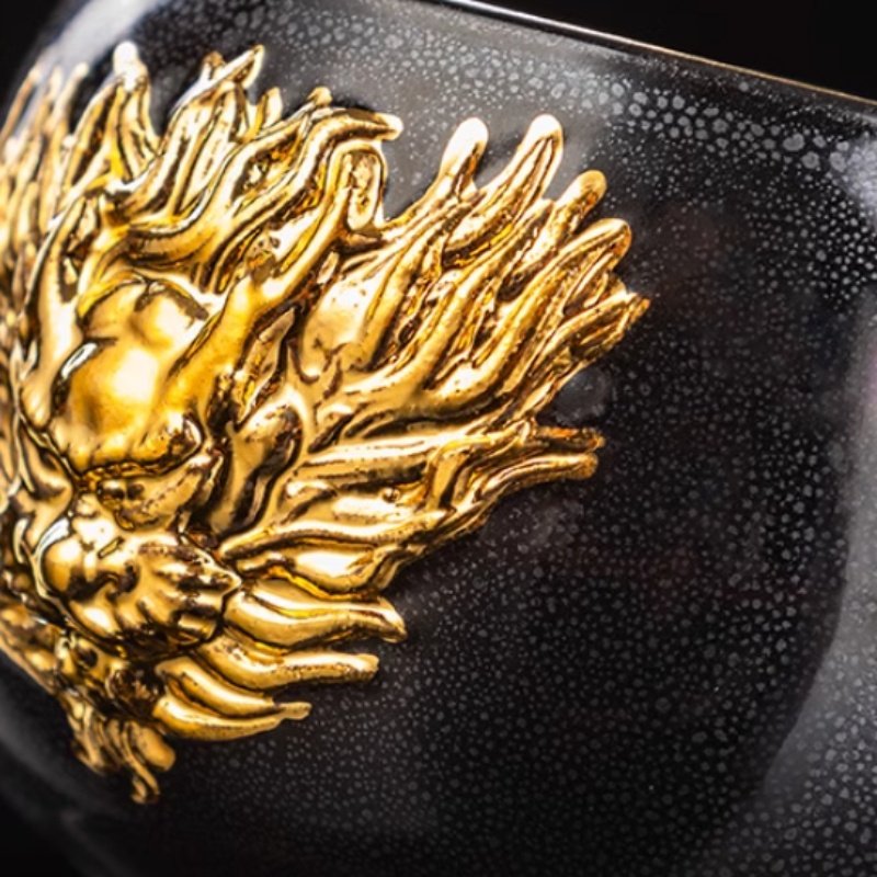 Ceramic Year Of The Dragon Gold Rim Tenmoku Glaze Jianzhan Tea Cup With Gilded Dragon Head Figurine. This tea cup, inspired by the Chinese Year of the Dragon, symbolizes strength, power, and good fortune. The Tenmoku glaze gives the cup a lustrous black finish, providing the perfect backdrop for the intricate gilded dragon head, which is the highlight of this design. The gold rim adds an elegant touch, complementing the boldness of the dragon figurine, making each tea-sipping experience a statement of luxury. Crafted with precision, this tea cup enhances the tea’s taste while paying homage to ancient ceramic traditions.Find more Jian Zhan tea cups.