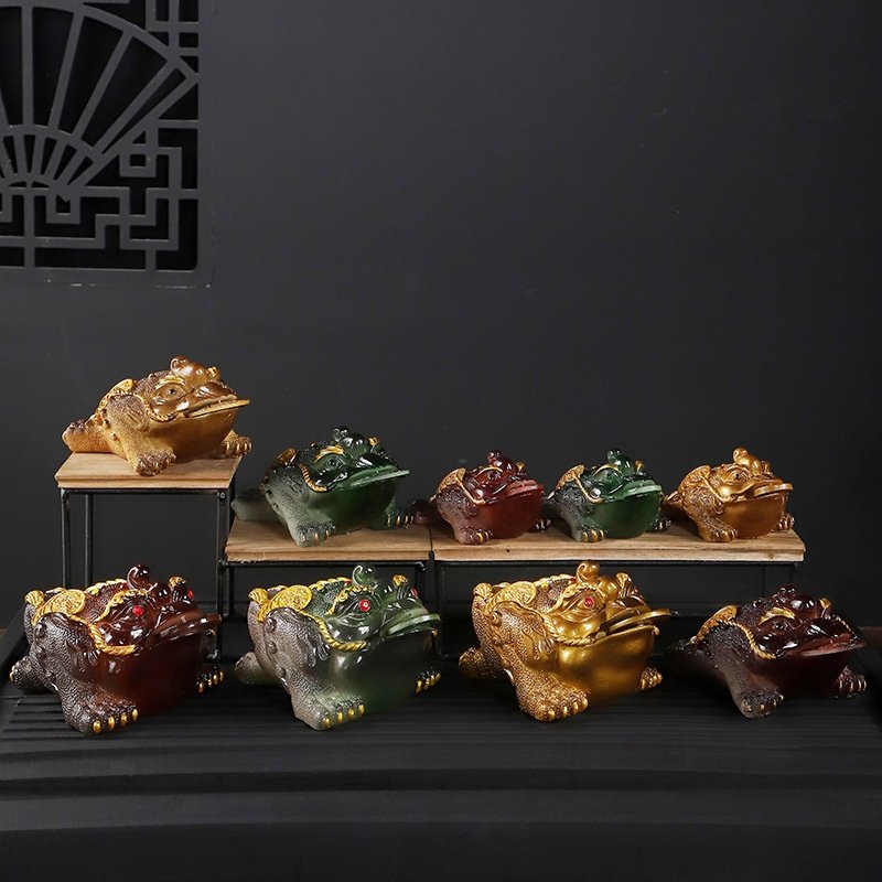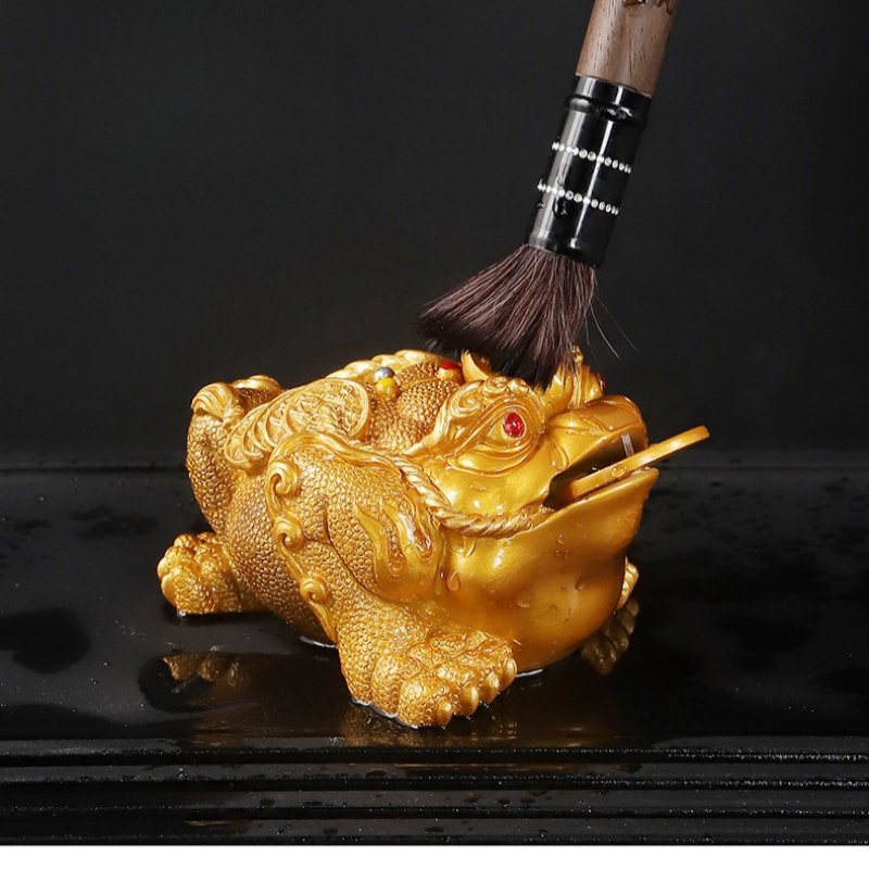 Chinese Gongfu Tea Ceremony Resin Color Changing Golden Toad Tea Pet For Sale. Rooted in Chinese folklore, the golden toad, or “Jin Chan,” is revered as a powerful emblem of wealth, fortune, and protection. This meticulously crafted tea pet is made from premium-quality resin, ensuring durability and longevity in your tea collection. The design features intricate, lifelike details, from the toad’s expressive red eyes to the delicate, ornate coins and auspicious symbols adorning its body. Each element is carefully sculpted to honor the traditional artistry and symbolism behind the golden toad. When warm water flows over it, this tea pet transforms with a stunning color-changing effect, shifting from deep tones to radiant golden hues, adding a magical element to your tea table. This interactive feature brings a dynamic energy to your Gongfu tea experience, captivating both the senses and the spirit, as it symbolizes the flow of good fortune and positive energy with each pour.