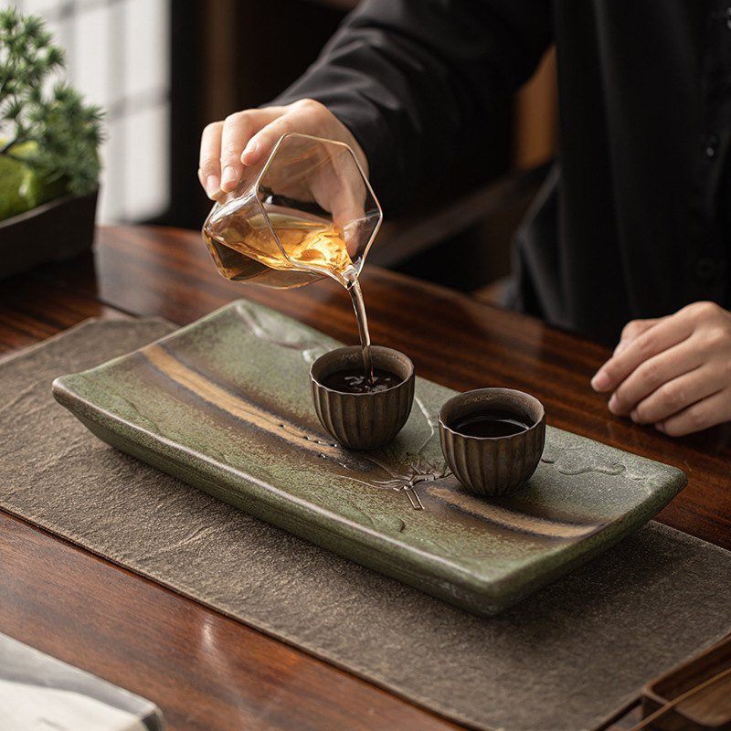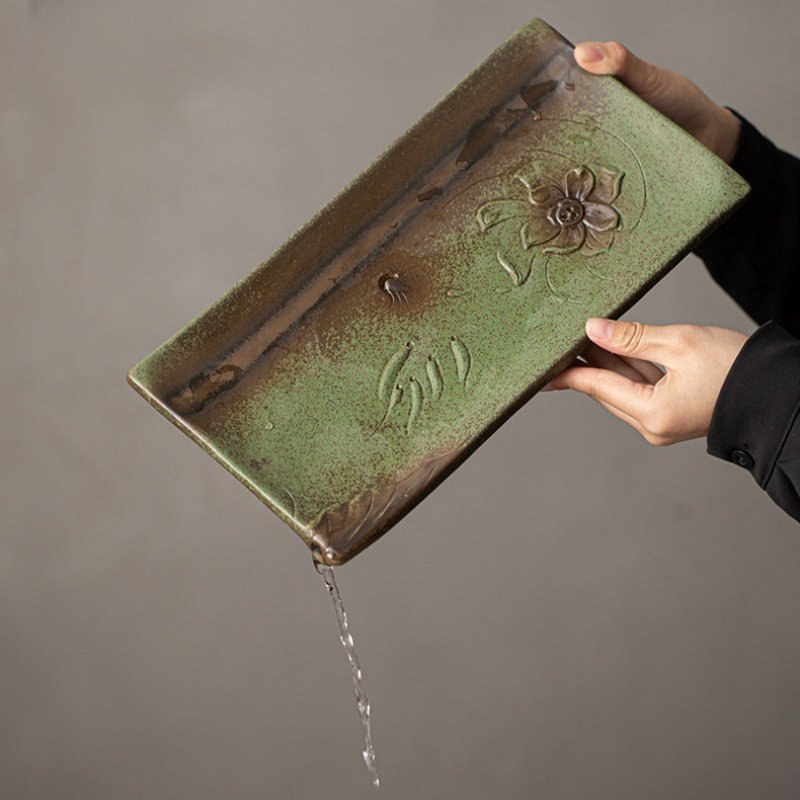 The Chinese Style Antique Kiln Gongfu Tea Set Serving Trays with Water Drains is a testament to traditional Chinese craftsmanship and artistry. This elegant serving tray, carefully crafted with an intricate floral design, showcases the unique fusion of antique aesthetics and modern functionality. Its rich green glaze, achieved through the ancient kiln firing process, brings an air of sophistication to your tea ceremonies. Designed for Gongfu tea lovers, this tray features an embedded water drain, ensuring a smooth and mess-free tea experience. The tray’s design is not only visually captivating but also functionally efficient. The smooth texture of the tray provides a stable surface for your tea cups and accessories, while the water drain helps to manage excess liquid, keeping your tea space clean and tidy. Whether you’re performing a traditional Gongfu tea ceremony or enjoying a casual tea moment with friends, this serving tray adds a sense of grace and refinement to your setting.