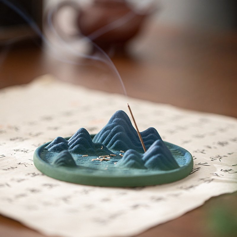 Expertly crafted from high-temperature fired ceramic, this incense burner features a unique multi-aperture design that accommodates incense sticks of various diameters, ensuring versatility in use. The carefully molded mountains on the burner create a picturesque scene reminiscent of flowing rivers weaving through mist-covered hills. As the incense burns, the smoke elegantly rises and drifts over the ceramic peaks, mimicking the natural beauty of a tranquil mountainous retreat.