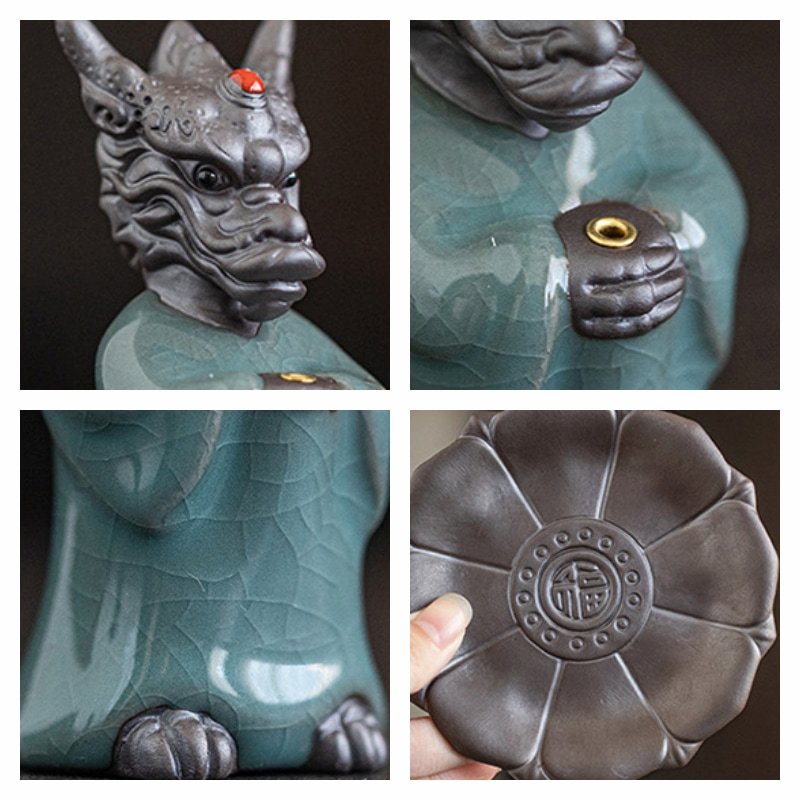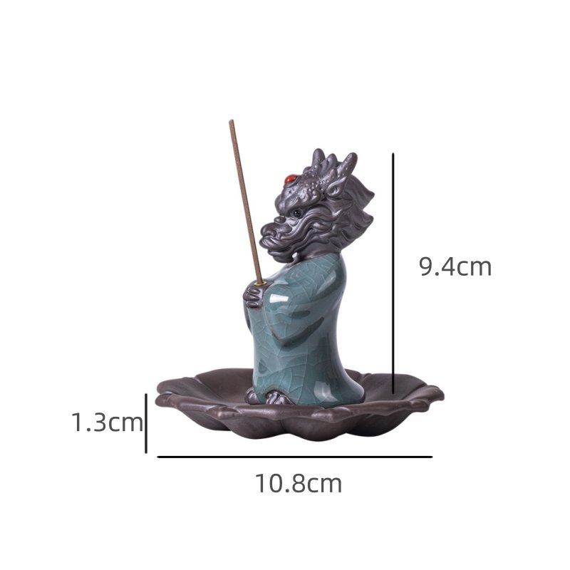 This striking stick incense burner holder is a symbol of wisdom and good fortune, represented by the meticulously crafted dragon that adorns the holder. With eyes gleaming with a touch of crimson atop its head, the dragon clutches an incense holder, allowing the stick to stand vertically while the ash collects neatly in the lotus-shaped base. The intricate ice crack pattern across the dragon’s body adds a layer of textural beauty, making this burner a stunning decorative item that complements any room.
