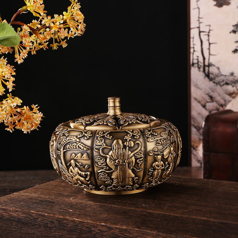 This stunning piece is meticulously crafted from high-quality brass, featuring intricate carvings that depict traditional Chinese scenes and motifs. The design is inspired by the pumpkin, symbolizing wealth and prosperity in Chinese culture. The detailed craftsmanship and antique finish make it not only a functional incense burner but also a beautiful decorative piece that adds a touch of sophistication to any room.