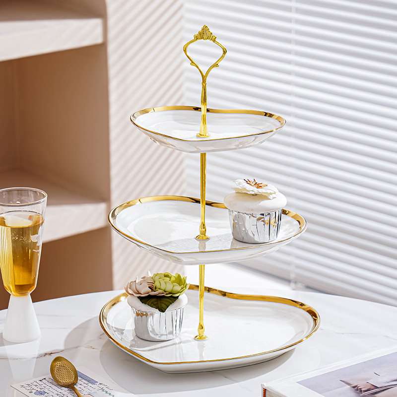 This versatile stand combines the luxurious charm of light gold iron art with practical functionality. Its overall detachable design not only makes it easy to store and clean but also allows you to customize the arrangement of the tiers according to your needs. Whether used for high tea parties, weddings, or as a chic organizational tool for keys and jewelry, this cupcake stand proves to be an indispensable item. The glossy glaze finish, complemented by electroplated gold edges, enhances the aesthetic appeal, reflecting sophistication and style.