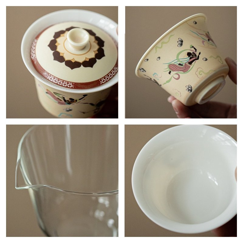 This exquisite tea set captures the ethereal beauty and dynamic movement of the Apsaras, their flowing garments and fluttering ribbons artistically rendered in traditional high-temperature fired ceramics. And this set is inspired by the celestial dance of the “Flying Apsaras” from Cave 305 of the Mogao Caves. Its compact, stackable design makes it ideal for travel, allowing tea enthusiasts to enjoy a luxurious tea experience wherever they go. The Dunhuang Antique Ceramic Travel Tea Set Case with Gaiwan combines the practicality of modern travel necessities with the elegance of ancient Chinese art, making it a unique blend of functionality and aesthetic pleasure.Find more Jian Zhan tea cups.