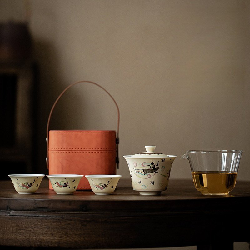 This Dunhuang Antique Ceramic Travel Tea Set Case with Gaiwan includes:1 Gaiwan (9 cm* 8 cm,4.06 fl oz), 1 Fair Cup (10 cm*7.5 cm,7.44 fl oz), 3 Teacups (6.2 cm*3 cm,0.85 fl oz), 1 case(11.5 cm*20 cm).Find more dragon tea set.