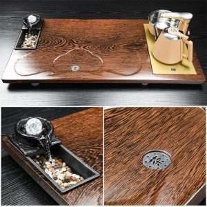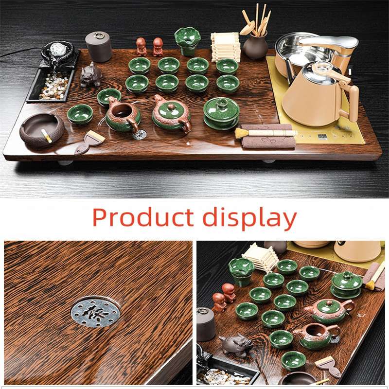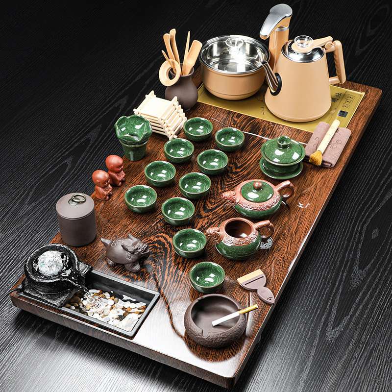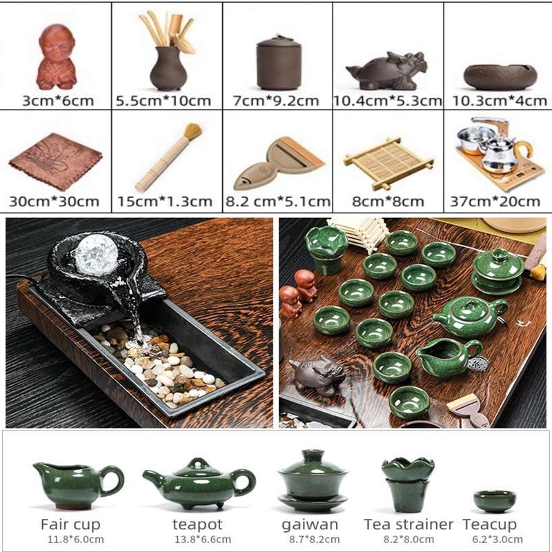 This elegant set includes : 1 Teapot ( 15cm*6.6cm , 160ml/5.4 fl oz ) , 1 Gaiwan ( 9cm*8.5cm ) , 1 Fair Cup (13.5cm*6.8cm ) , 10 Tea Cup (6.5cm*3.5cm ) , 1 Tea Tray (92cm*44cm*5cm ) , 1 Tea Utensils Sets ( 5.5cm*10cm ) , 1 Tea Infuser ( 8.5cm*8.5cm ) , 1 Tea Caddy(7cm*9.2cm ) , 1 Tea Scraper ( 8.2cm*5.1cm ) , 1 Teapot Maintenance Brush ( 15cm*1.3cm ) , 1 Automatic filling water bottle ( 37cm*20cm ) , 1 Ashtray (10.3*4cm ) , 2 Tea Pet (3cm*6cm ) , 1 Tea Towel ( 30cm*30cm ) , 1 Yixing Clay Dragon Turtle ( 10.4cm*5.3cm ) , 6 Coaster ( 8cm*8cm ) .Find more Japanese tea sets.