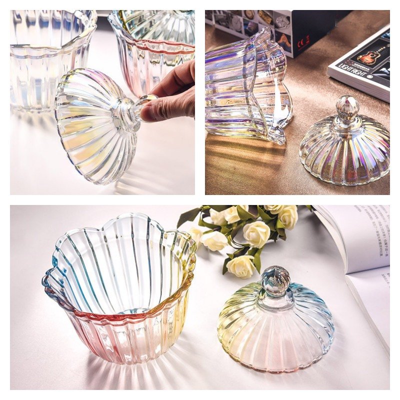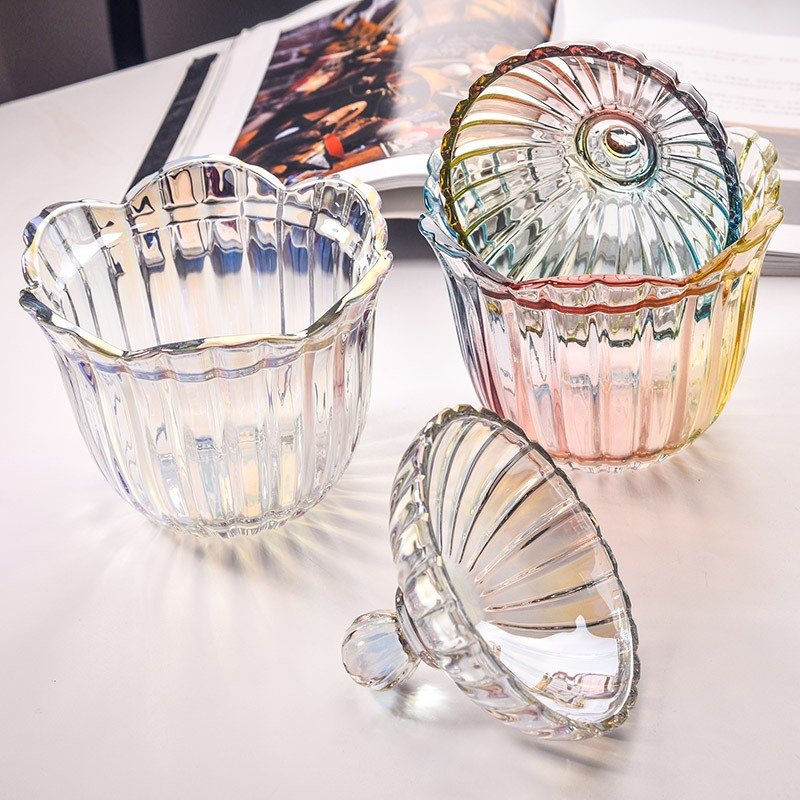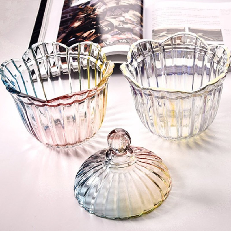 European Vintage Style Flower Shaped For Clear Glass Personalized Candy Table Jars. These exquisitely crafted jars bring a sense of elegance and sophistication to any space. Featuring a unique flower-shaped design with delicately scalloped edges, they effortlessly combine vintage charm with modern practicality. The high-quality clear glass construction showcases superior craftsmanship, ensuring durability while delivering exceptional visual appeal. These jars are designed to reflect light beautifully, creating a soft, radiant glow that highlights their contents and adds a warm, inviting ambiance to your table. The sturdy, fitted lid is adorned with an elegant glass handle, making it both functional and aesthetically pleasing. Perfect for holding candies, chocolates, cookies, or even small desserts, these jars serve as eye-catching centerpieces for candy tables, dessert buffets, or dining setups. Their timeless yet versatile design is ideal for weddings, tea parties, or everyday use, seamlessly blending into any theme or occasion.