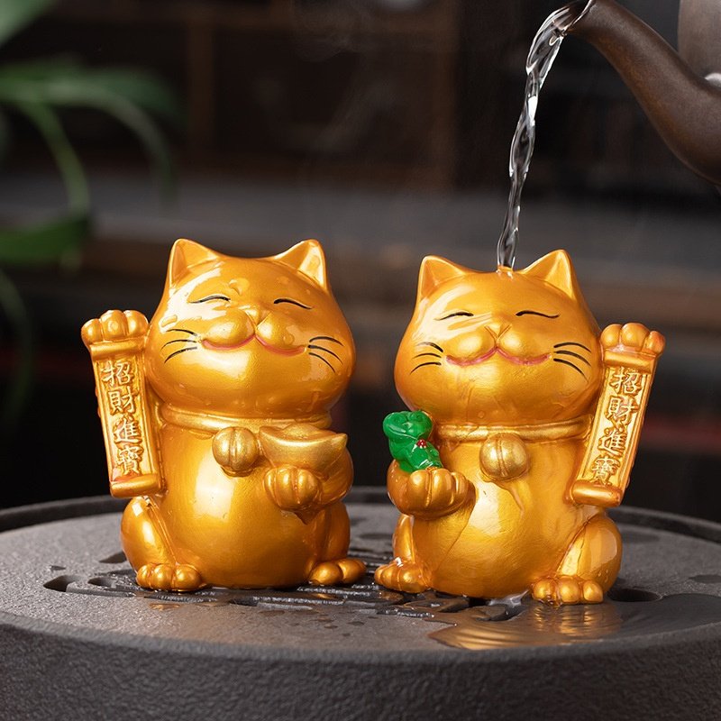 Gold And Green Color Changing Lucky Fortune Cute Cat Resin Tea Pet Decoration. Inspired by the beloved Maneki-Neko, or “lucky cat,” this tea pet brings a symbol of good fortune, wealth, and positive energy to your tea table. Crafted from high-quality resin, this tea pet is meticulously designed to capture the essence of cultural symbolism while adding a delightful touch to your Gongfu tea ceremony. The lucky cat features a cheerful expression, a raised paw to beckon in prosperity, and a lucky banner that enhances its welcoming spirit. When warm water flows over it, this charming tea pet undergoes a beautiful color transformation, shifting from a bright gold to a calming green. This dynamic effect captivates all who witness the change, adding a layer of magic and joy to each pour. As you pour water over it, this tea pet comes to life, creating a lively and interactive element that enhances the overall tea experience, while symbolizing the flowing energy of good luck and positivity.