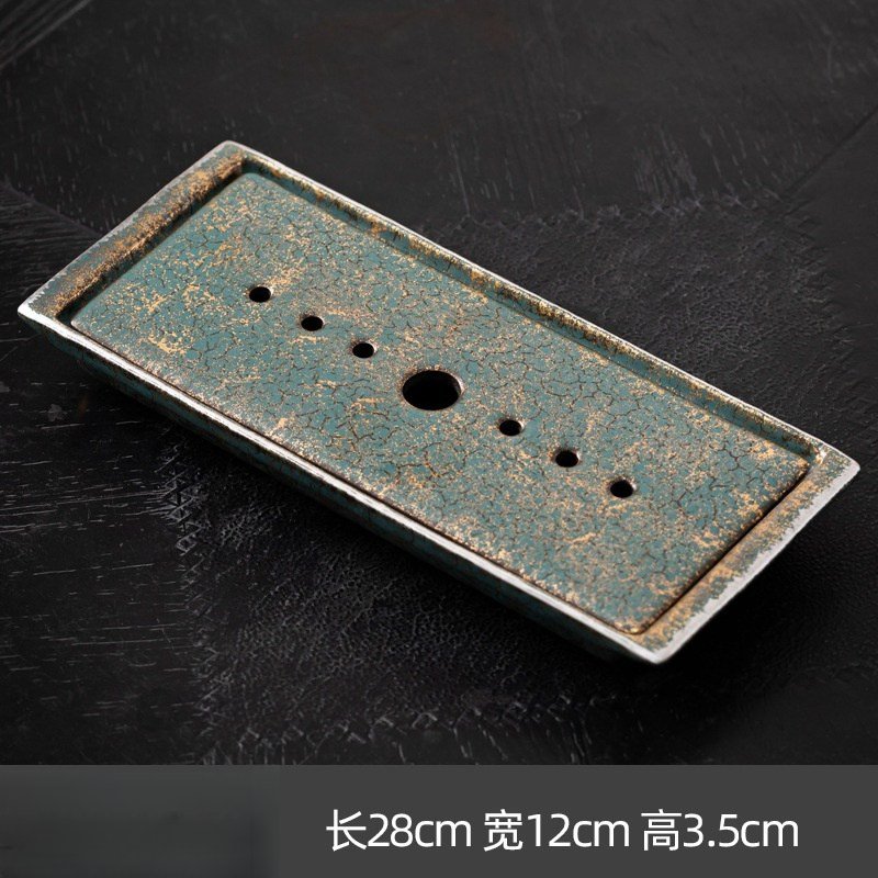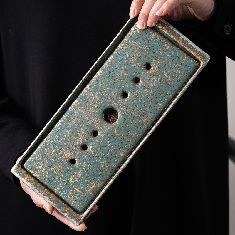 The Gold and Silver Colored Water Storage Drains Gongfu Tea Tray with Evergreen Glaze is a stunning example of blending traditional craftsmanship with modern aesthetics. This elegant tray is coated with an evergreen glaze that brings a natural, tranquil appearance to your tea setup. Accents of gold and silver speckles subtly decorate the surface, creating a unique texture that reflects light beautifully. The tray’s built-in water storage drains ensure a clean and organized tea ceremony, while its robust construction guarantees longevity. This tray is designed with functionality in mind, featuring multiple drainage holes that help efficiently manage water during Gongfu tea preparation. The evergreen glaze not only adds visual appeal but also enhances durability, protecting the tray from wear and tear over time. Its rectangular shape offers ample space for a complete tea set, making it perfect for both intimate tea gatherings and everyday use.