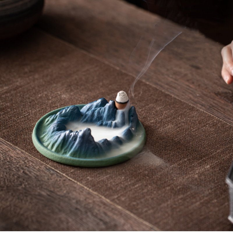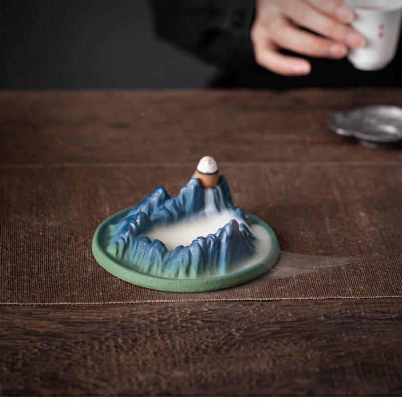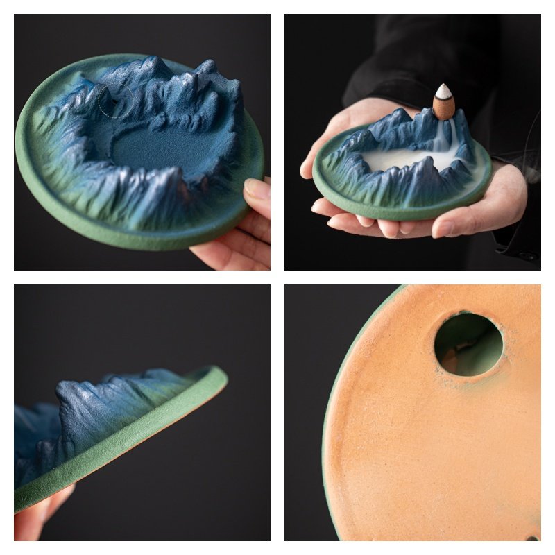 Crafted with high-temperature firing techniques, this incense burner showcases a stunning green mountain relief that evokes the tranquility of lush landscapes. The surface features a variable glaze finish that enhances its ancient allure, adding a classic touch to any setting. As the cone incense burns, watch the smoke mimic a gentle waterfall flowing down the mountainside, creating a visually captivating and soothing display that enhances your relaxation or meditation experience.