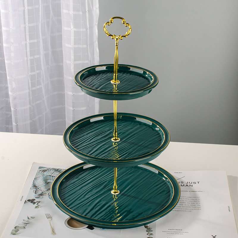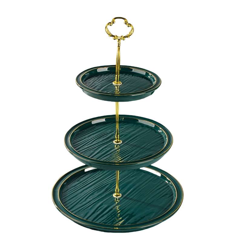 This Green Wooden Texture Green Ceramics Afternoon 3 Tier High Tea and Coffee Plate Stand combines functionality with aesthetic elegance, featuring ceramic plates with a lush green wooden texture finish. The high-temperature fired glaze ensures a smooth, refined surface that’s a pleasure to touch and easy to clean. The stand’s intricate design, highlighted by a light luxury dual gold rim, adds a touch of sophistication to your table setting, making it perfect for serving sweets, savories, or fruits during gatherings.