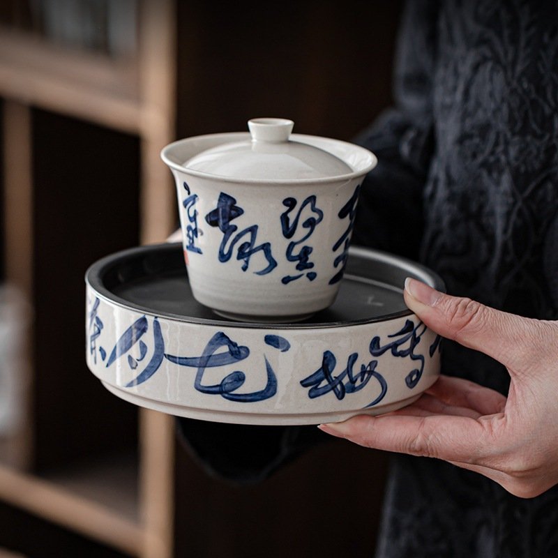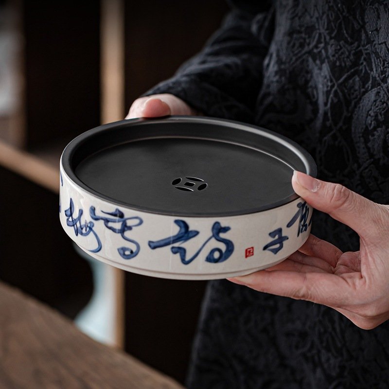 Durable High-Quality Ceramic, Handpainted Calligraphy Design, Round Shape with Elevated Edges, Traditional Poetry Theme, With Storage