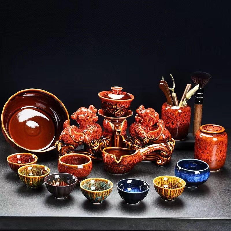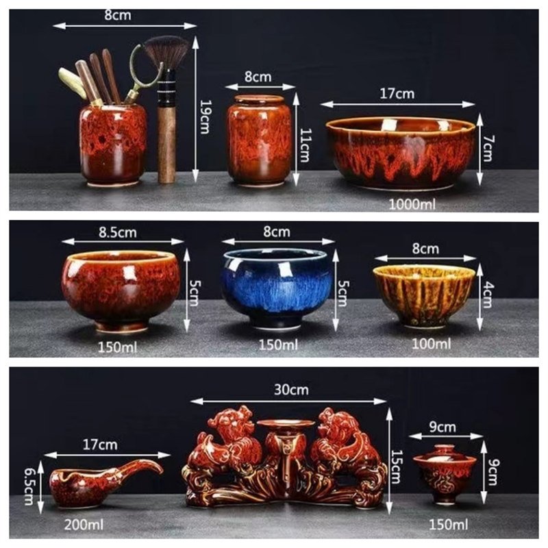 This Kiln Change Colorful Glaze Ceramic Automatic Lazy Teapot and Cup Set includes 2 types : 11 Sets and 14 Sets . The 11 Sets includes : 8 Tea Cup (8.5cm*5cm , 150ml/5.1 fl oz . 8cm*5cm , 150ml/5.1 fl oz . 8cm*4cm , 100 fl oz/3.4 fl oz ) , 1 Fair Cup ( 17cm*6.5cm , 200ml/6.8 fl oz ) , 1 Tea Brewer (Base: 30 cm*15 cm , Gaiwan : 9 cm*9 cm , 150ml/8.1 fl oz) . The 14 Sets includes : 8 Tea Cup (8.5cm*5cm , 150ml/5.1 fl oz . 8cm*5cm , 150ml/5.1 fl oz . 8cm*4cm , 100 fl oz/3.4 fl oz ) , 1 Fair Cup ( 17cm*6.5cm , 200ml/6.8 fl oz ) , 1 Tea Brewer (Base: 30 cm*15 cm , Gaiwan : 9 cm*9 cm , 150ml/8.1 fl oz) , 1 Tea Washer (17cm*7cm , 1000ml/34 fl oz ) ,1 Tea Utensils Sets ( 8cm*19cm ) , 1 Tea Caddy (8cm*11cm ) .Find more tea serving trays.