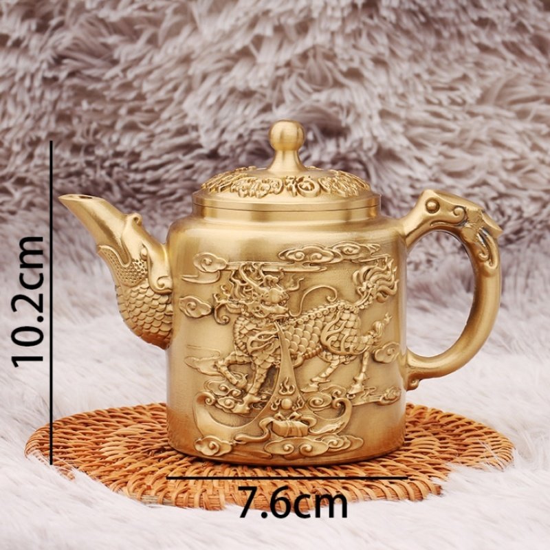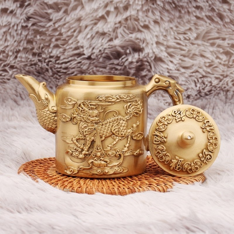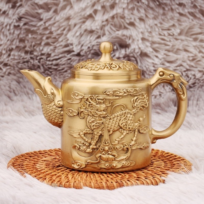 Introducing the Large Hand Carved Foo Dog and Blessing Theme Brass Teapot with Fish Spout, an extraordinary piece that blends traditional craftsmanship with intricate symbolism. This stunning teapot features a hand-carved design showcasing a Foo Dog, a symbol of protection and strength, alongside motifs of blessings. The spout is uniquely shaped like a fish, adding another layer of cultural significance, symbolizing abundance and prosperity. Whether you’re brewing a pot of tea or using it as a statement piece, this brass teapot brings together artistic detail and cultural heritage in a magnificent way. Made from high-quality brass, this large teapot is designed for durability and long-lasting beauty. The fine craftsmanship is evident in the intricate carvings, which showcase remarkable attention to detail. The golden hue of the brass enhances the teapot’s ornate design, giving it a timeless and antique feel. Its sturdy construction ensures it can be enjoyed for both functional and decorative purposes, whether displayed as a collector’s item or used in daily tea rituals.Find more Chinese teapots.