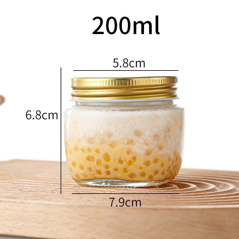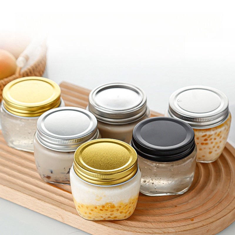 Multi-Functional Small Cute Clear Glass Bulk Mason Candy Jars For Candy Table With Multi-Colored Lids.Lids color includes 3: Black, Golden, Silver, featuring dimensions of 7.9*6.8cm, lid diameter 5.8cm. capacity 200ml.
