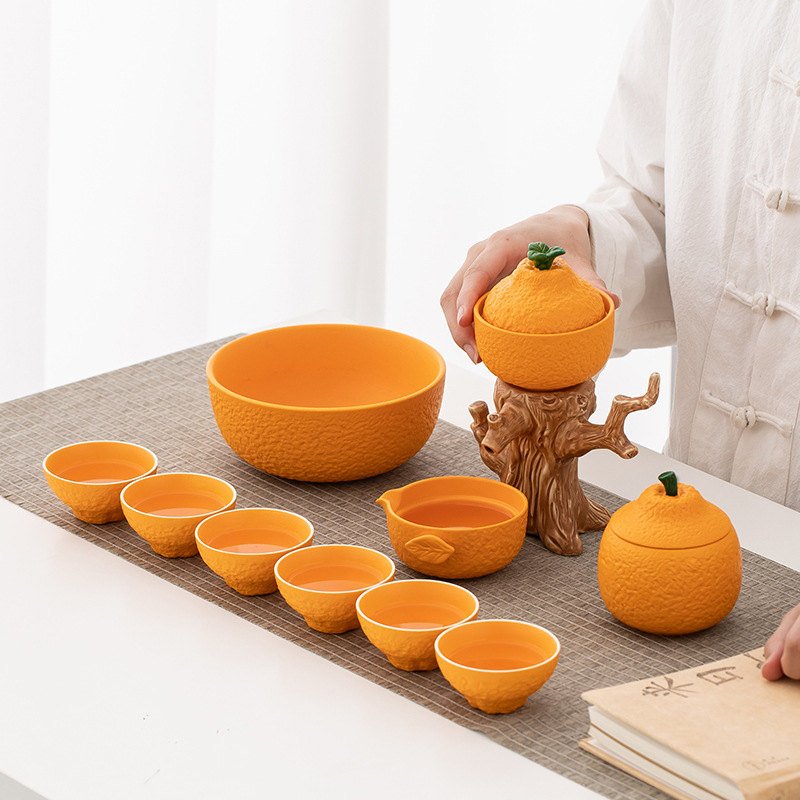 This semi automatic lazy tea setOrange Shape Ceramic Lazy Semi Automatic Tea Set is available in 2 types: 9 Set and 11 Set. The 9 Set includes: 6 Teacups (6 cm*4.3 cm,2 fl oz),1 Teapot with Base (Teapot: 9 cm*8.6 cm,Base: 10 cm*14.5 cm),1 Fair Cup (4 cm*9.5 cm,3.4 fl oz). The 11 Set includes: 9 set configuration and 1 Tea Caddy (9.7 cm*8.6 cm,4.1 fl oz), 1 Tea Washer(6.3 cm*15.4 cm,20.3 fl oz).Find more fat cat tea pets.