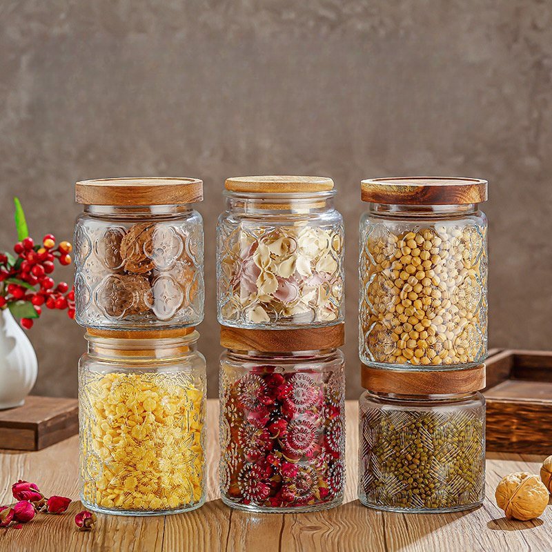 Personalized Vintage Pattern Gift Bulk Glass Mason Candy Jars With Lids For Office Desk.Designed with both elegance and functionality in mind, these jars are crafted from premium-quality glass, featuring intricate vintage-inspired patterns that exude timeless charm. Each jar is adorned with beautiful floral and geometric embossing, giving it a sophisticated, artisan-crafted appeal. The addition of natural wood lids enhances the rustic yet elegant aesthetic while ensuring practicality with their airtight seals, which effectively keep your contents fresh and protected from dust.Perfectly suited for both storage and decoration, these versatile glass jars seamlessly combine beauty and practicality. Their compact and ergonomic design makes them ideal for use on office desks, kitchen countertops, or bookshelves. Use them to organize your snacks, display colorful candies, or store pantry essentials like spices, grains, and dried fruits. The clear glass construction allows you to easily identify the contents while showcasing their vibrant colors or textures. These jars not only provide convenient storage but also serve as statement pieces that enhance the visual appeal of your space.