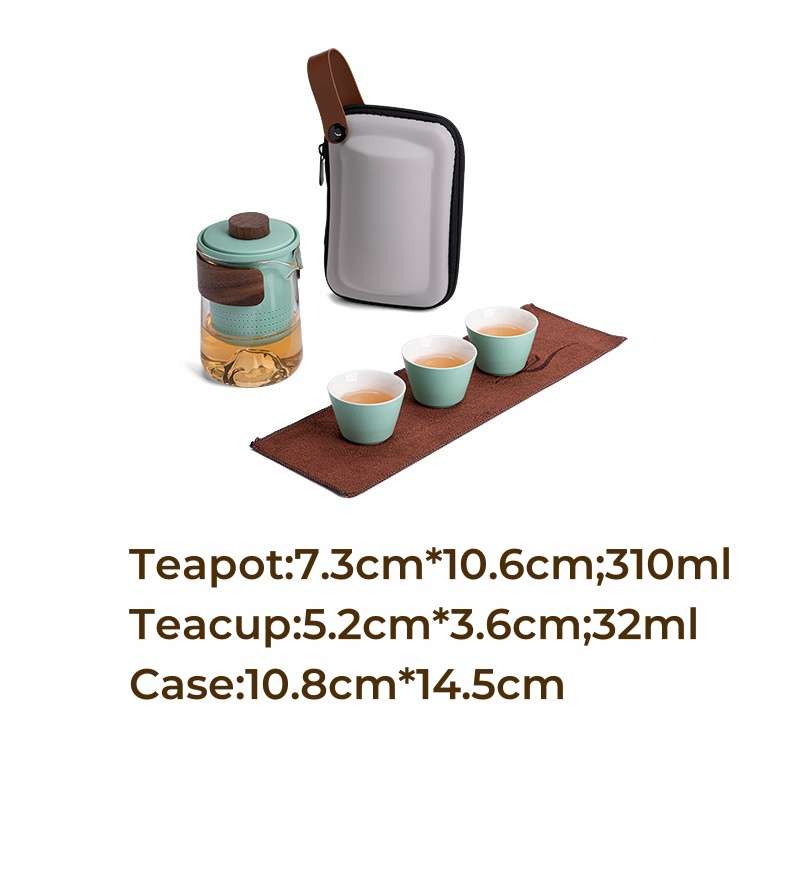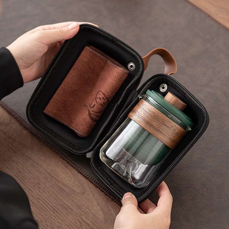 This travelling tea set  is not just about practicality but also about enjoying your tea in style. The borosilicate glass pot is robust, with a large capacity to cater to your needs, whether you are alone or with company. It features a unique 3D iceberg design that subtly peeks through the clear glass, adding an artistic touch to your tea time. The V-shaped spout ensures a smooth pour, while the wooden handle provides a burn-free grip, making it safe and comfortable to use. The ceramic inner core and capsule-like shape with upgraded comprehensive filtering allow for quick separation of tea leaves from the water, ensuring a clean and flavorful tea experience every time. Additionally, the accompanying case is equipped with a secure zipper closure and a durable handle, which not only protects the tea set during transport but also adds an extra layer of convenience for carrying. The case’s sleek, minimalist design complements the elegant and modern aesthetic of the tea set, making it a stylish accessory for any tea lover. Whether you’re heading to a picnic, a day at the office, or a weekend getaway, this travel tea set ensures you can enjoy your favorite teas with ease and sophistication.Find more Japanese teapot set.